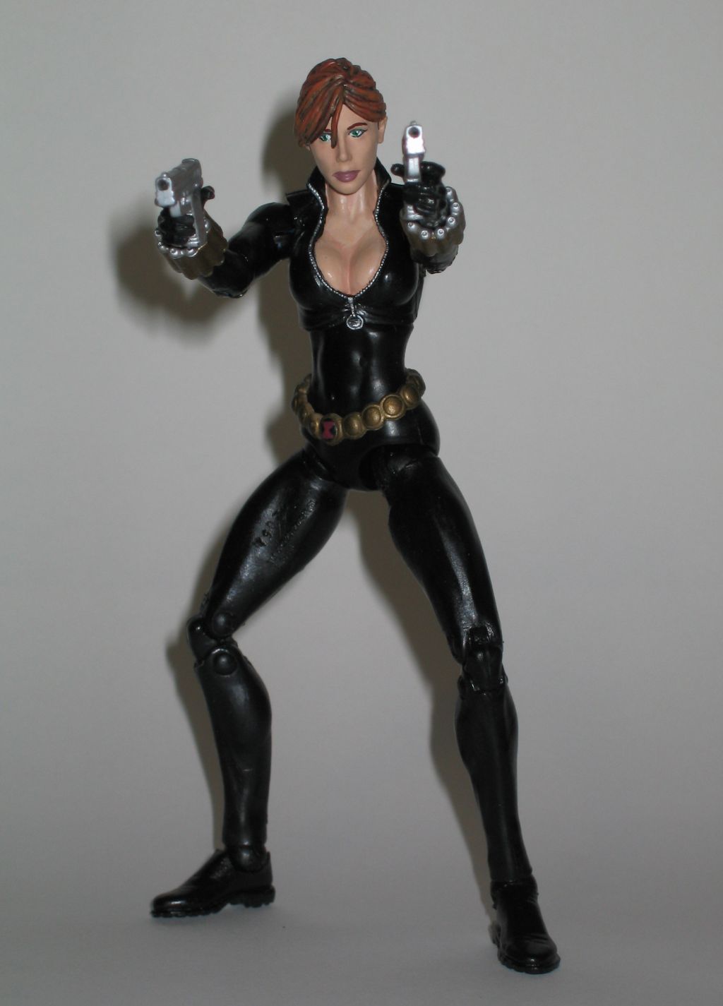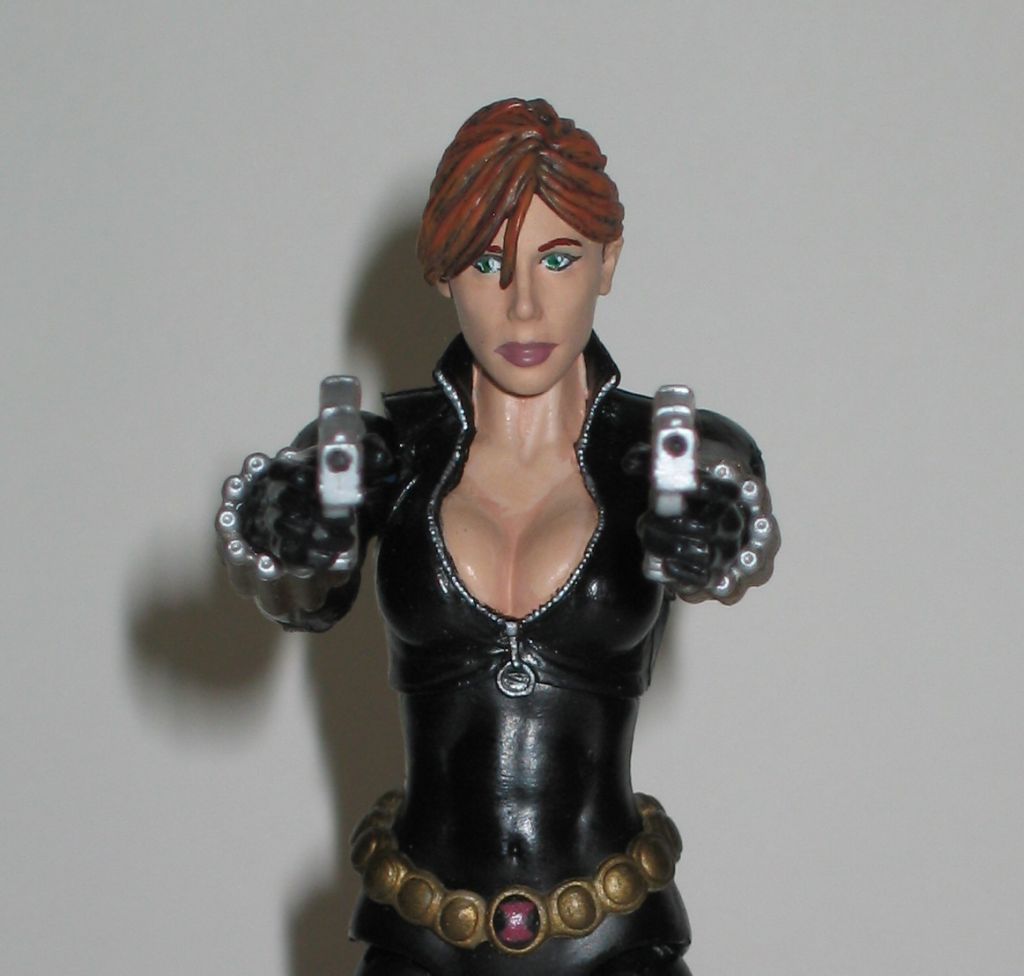 I missed out on getting the two pack Black Widow, so I decided to make my own. She is a pretty simple recipe: the base figure is a ROML Mystique, a casting of the two pack Widows head, and Series 8 Black Widow's Belt and Bracers I also use the head for an alternate with X3 Jean Grey's hair. I also modified the feet to add Revoltech joints to give her ankle pivots. Now she can stand flat footed on the ground. Then I finished her up with a complete paint job.