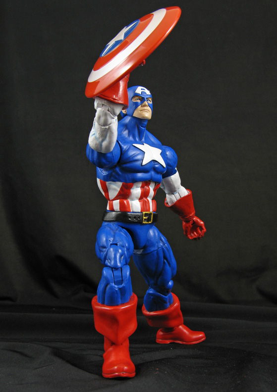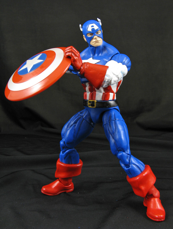 It's time for more Marvel vs Capcom 2 goodness with Captain America this time! Based on the game art and sprites this custom Marvel vs Capcom 2 Captain America was made using a Marvel Legends Hyperion body, USAgent expanded glove cuffs, Dakken belt, and a Steve Rogers head. The head and star were sculpted using Aves Studios Apoxie sculpt and designed to look like they do ingame rather than the comic. Captain America's domed shield comes from the Avengers Assemble battler figure and magnetically attaches to his wrist and back. A bald eagle was added to simulate his win pose from the game as well. Now Captain America is ready to battle!