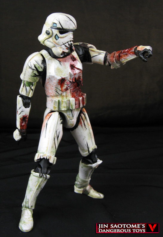 They shamble, they groan, they have better aim dead than alive, it's the Deathtroopers! Straight from the Star Wars novel aptly named 'Deathtroopers' this figure was created much like the first one using a Star Wars Black series Sandtrooper with a hollowed out helmet that fits on top of a modified Face Off Marvel Legends Red Skull head. The torso was opened up and organs sculpted in along with the arm bites. Quite a few different paint effects were used to simulate the art of fungus covered, dirty, stained trooper armor with actual cracks and chunks taken out of it along with dirty bandages. Watch out, the Death Troopers are on the move...