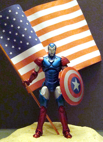 Repaint of the Marvel Universe extremis armor Iron Man with the shield from the vibranium armor mk.VI Iron Man. Straightened up the legs a bit, removed some plastic from the hip joints so he could put his feet together, drilled a hole through his right hand to hold a flag pole. Added a wash and viola. Now I just need to find a better flag.