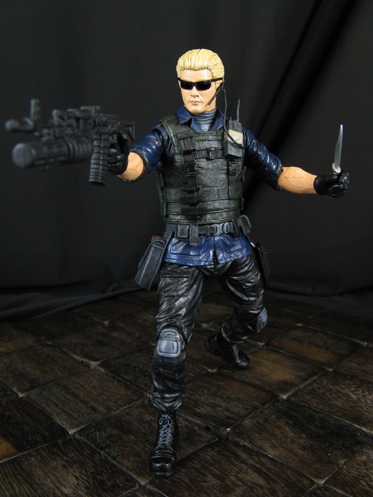 It's time to fill out the ranks of NECA's 7" Resident Evil figures and here's Albert Wesker of the Umbrella Corp to add to the zombie terror. Here this custom Wesker was based off his Resident Evil 5 look using the Kick Ass 2 Captain Stars and Stripes, Sam Fisher vest with various belts/fodder parts, Rambo lower arms, and Hunger Games Kato head with sculpted hair and glasses using ProCreate modeling putty. Wesker was given some firepower, an earpiece communicator, and a vial of the T-virus to infect everyone with!