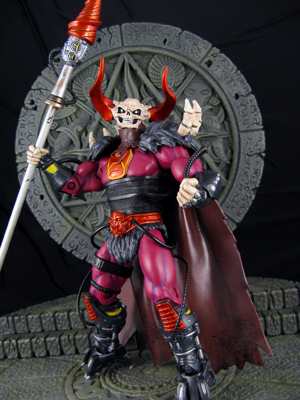 Eternia has seen its share of tyrants but deep below dwells a being so dangerous, so ruthless, he can only be called...Terra-Bull! Twisted brother of Terra-Starr, this villain has plans for Subternia's Crystal Core and only the combined might of the heroes above and below can stop him! Terra-Bull was created using a Hydron Body, Space Skeletor legs, Crysis figure hooves, King Grayskull cape, FFVII Guardian Force Odin hands, 4H Timekeeper head, and various other fodder parts for armor and details. He features metallic red sections and comes with a Drill Staff he can use to tunnel his way through his foes. Watch out Eternia, Skeletor has competition!