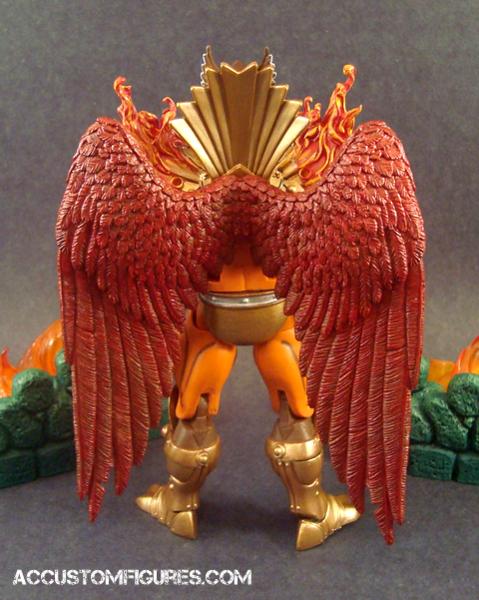 Lord Fire-Bird was made from a MOTUC buck, Redaki lower arms, ML Angel wings and fodder armor. I can’t remember what the head is from. Finished him with a blazing phoenix paint job. Enjoy!