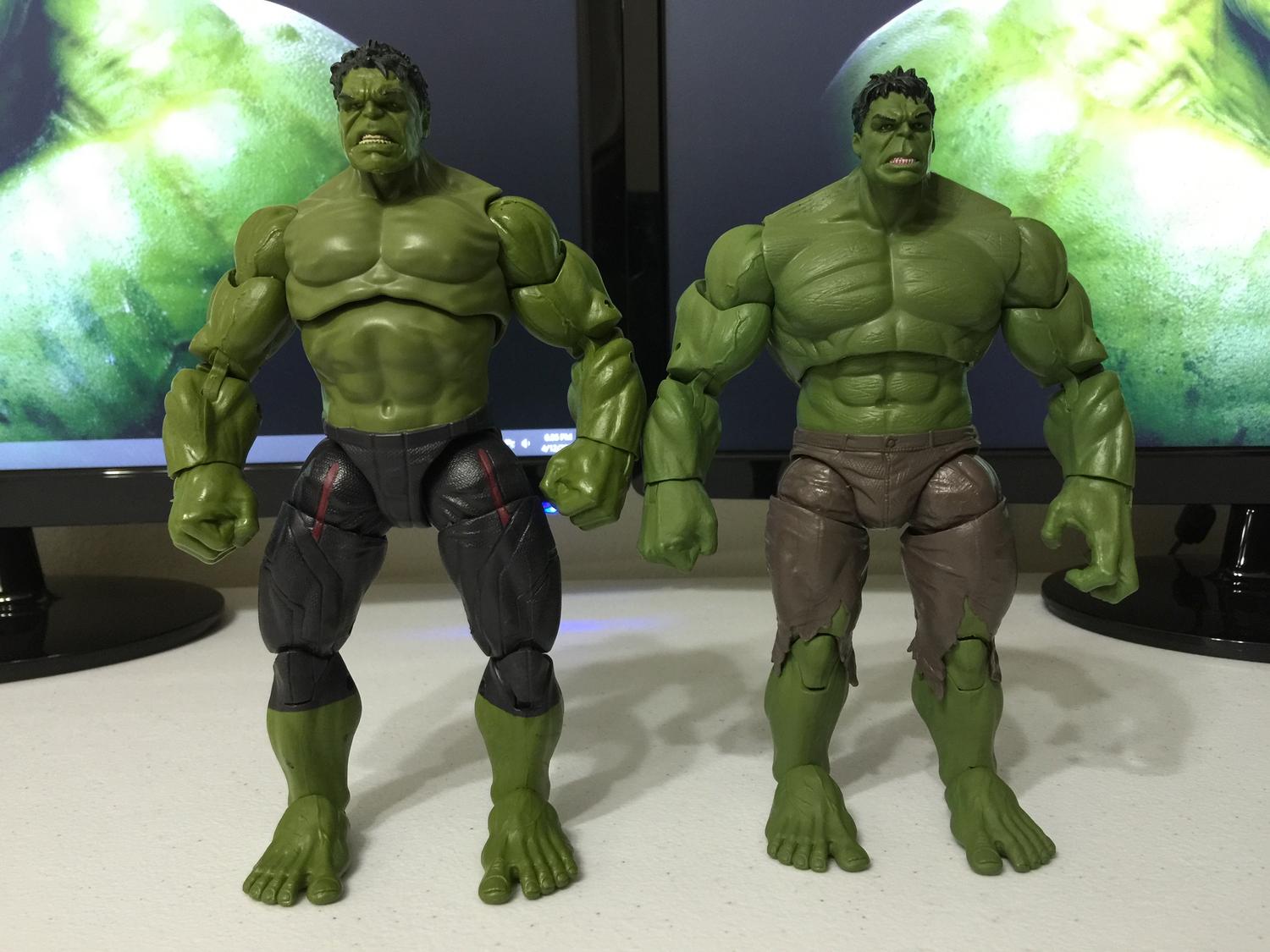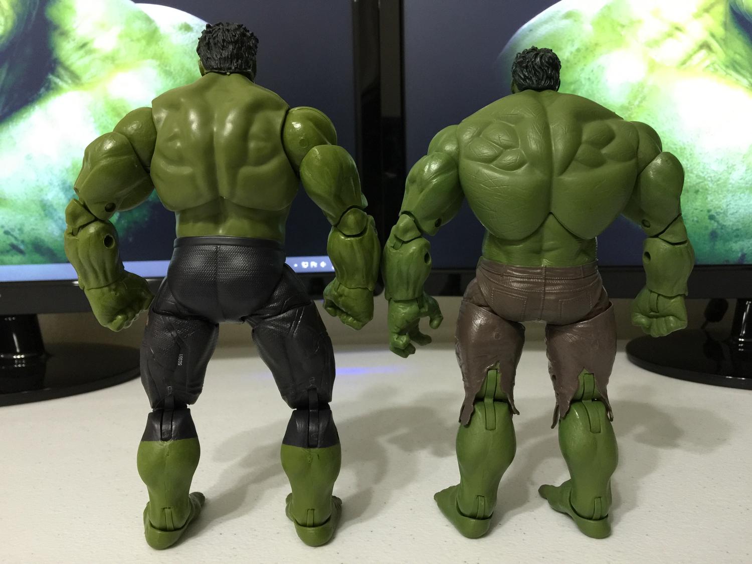 Wow! I am very impressed with both of these Hulk Figures. On the left of your screen we have the new BAF ML Avengers 6' Hulk and on the right is the older Walmart Exclusive Avengers Movie Masters 6' Hulk. The ML one is a little bit taller, is wearing the Avengers uniform pants and with two fists he is ready to SMASH. The MM one has a much more defined and muscular back, is wearing the classic torn pants and has his left hand open ready to CRUSH. I really love both of these figures!
