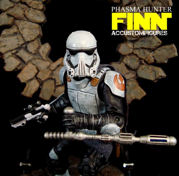 Once recovered from his injuries suffered at the hand of Kylo Ren at the end of TFA, Finn hears news of Captain Phasma’s escape from the trash compactor on Star Killer base. With the aid of a new cybernetic spine and modified armor cobbled together from fallen New Order Stormtroopers, Finn decides Phasma is his responsibility and teams up with Poe Dameron to hunt her down. Equipped with a resolve to support his friends and the resistance, Finn customizes an array of weapons designed to match Phasma blow for blow. Finn is now a Phasma Hunter.