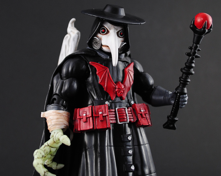 Plaguestor was created from a Hordak figure, the back of Knightmare Batman's trenchcoat, Armored Batman's cape, TMNT Rat King's hat, custom sculpted mask, Funko mini Arkham Scarecrow head, Skylanders accessory claw, and other fodder parts. He was airbrushed using Testors Aztek acrylic airbrush paints and given a liquitex varnish sealer.