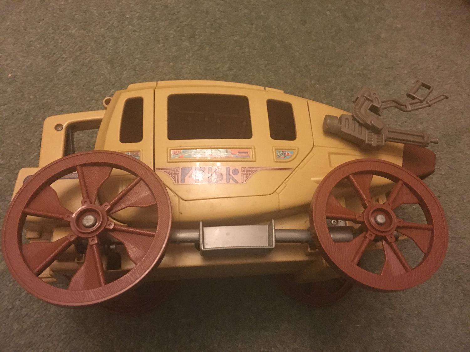 I was wondering if any one had any ideas what this toy is? It is a stagecoach and when you pull the back lever the wheels go out and go flat. I think it is between 1950's and 1980's. It was originally with lots of star wars items which my mum had but I don't think this is Star Wars (although there is a gun on there). Any help? Thank you in advance.