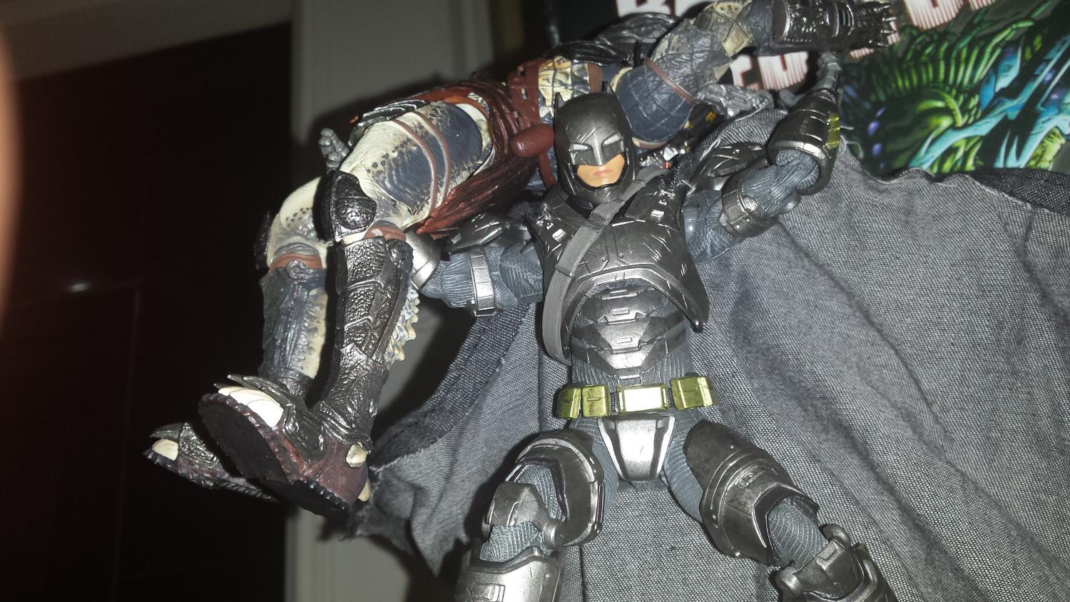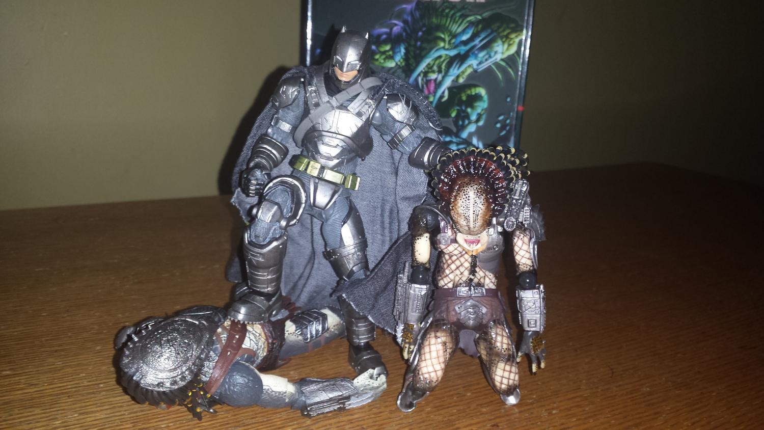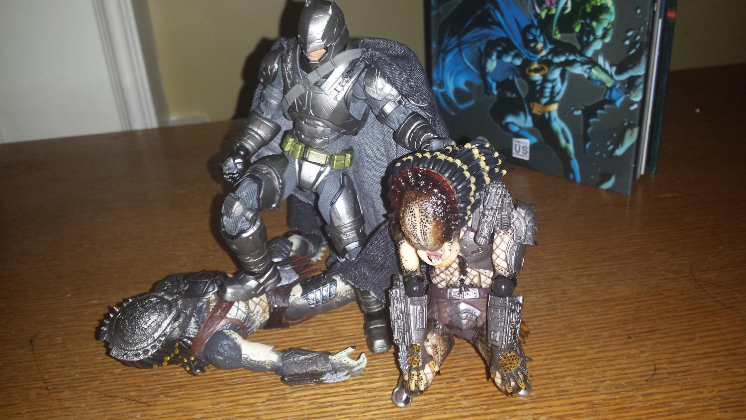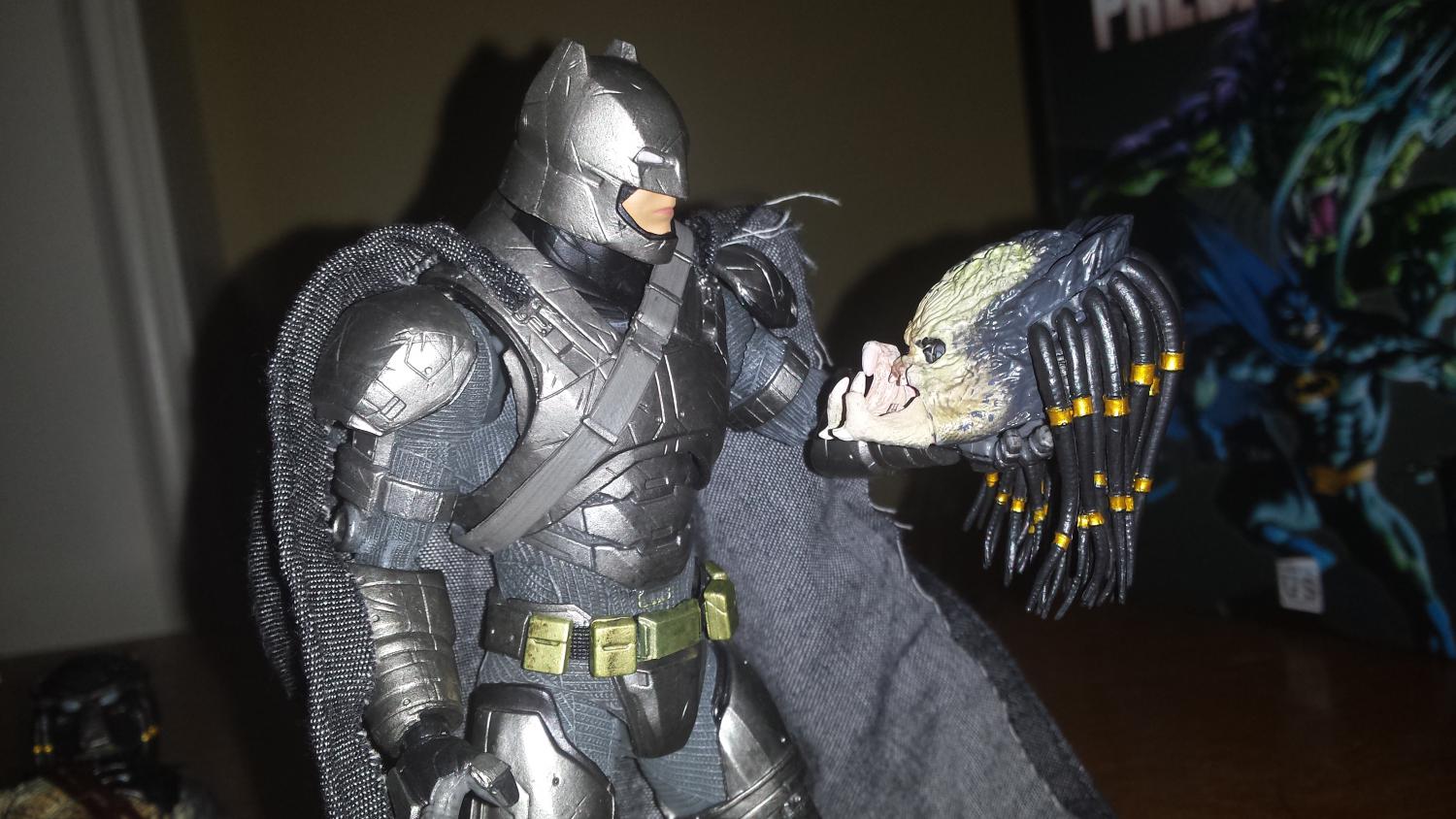 The only reason i got Mafex Armored Batman was that i could pit him against my Predators! This figure has an amazing balance..in one of the pics i posed him with the SH Figuarts Predator lifted on his head..without having to use any support or stands. Even the Revoltech Predator makes a cameo. Armored Batman actually does looks like he can kick Predator's ass.