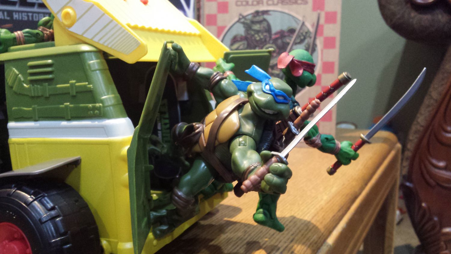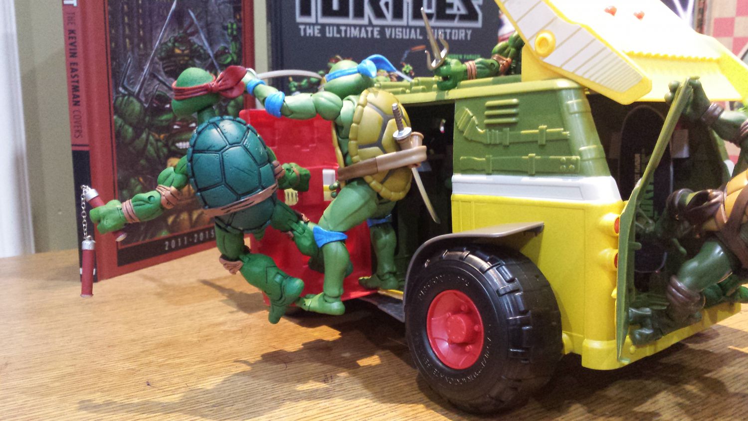 Turtles Forever! Turtles from 4 generations ward off attacks from all side of the party van. Revoltech Donnie is the driver..with revoltech Leo in the front cabin. Sh Figuarts Leo and Neca Mikey fighting off foot soldiers from the side door. Neca Raphael on the rooftop with 2003 Leo and Neca Leo defending the rear side of the van. Notice that two front cannons are formed from Mega Bloks..they are fully functional with light and sound at the press of a button.