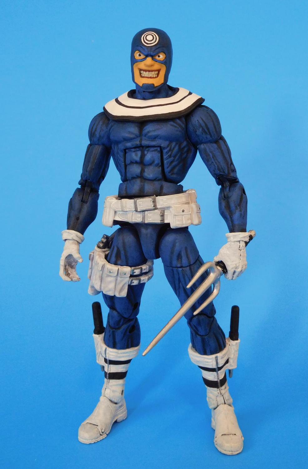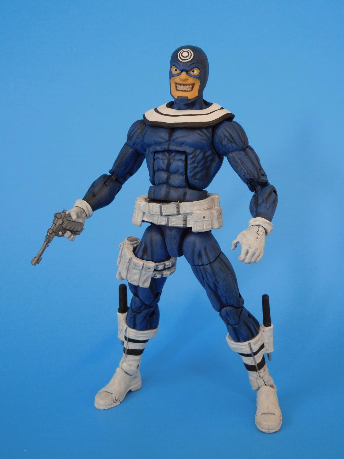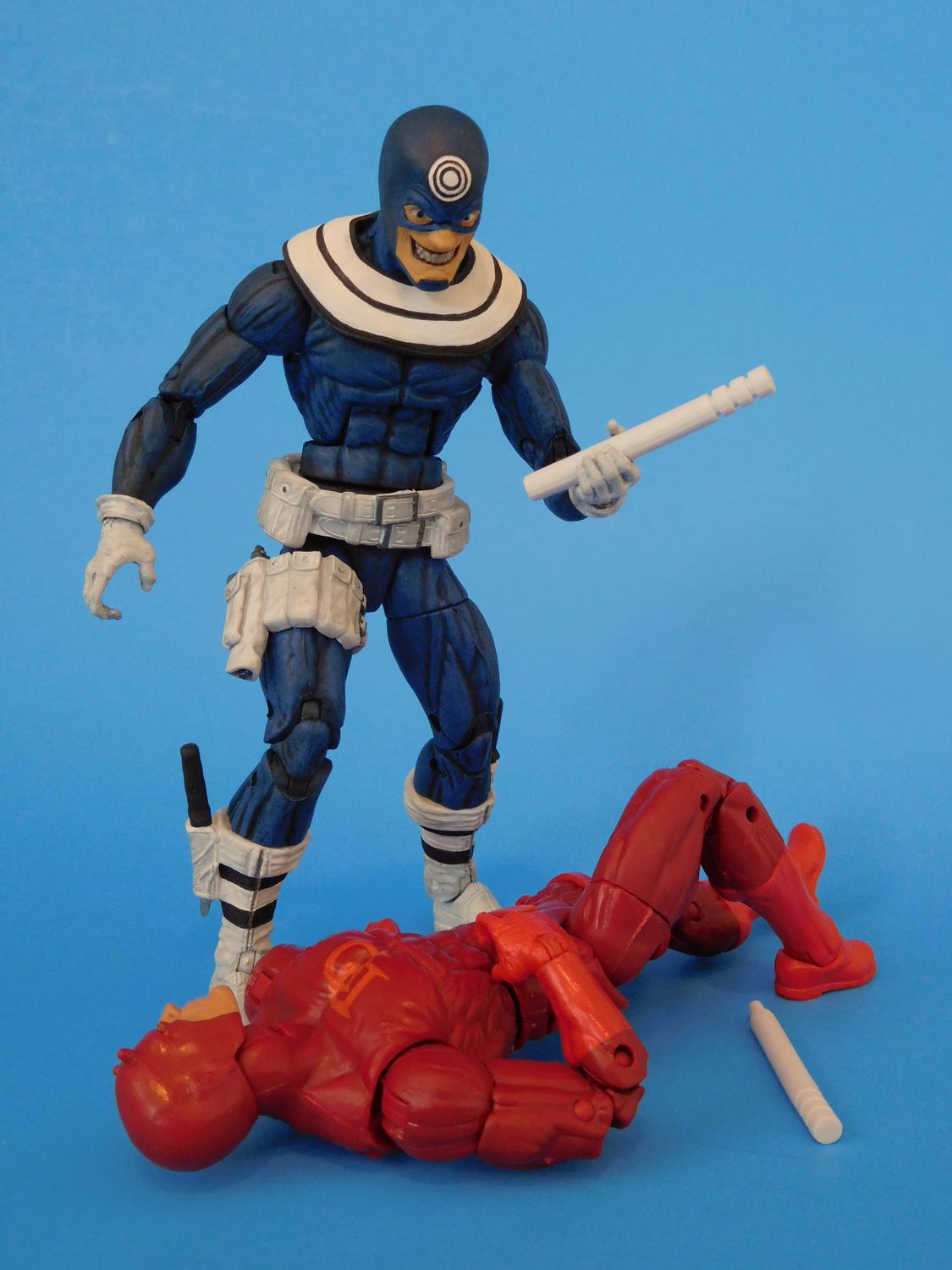 The old Toy Biz Bullseye isn't terrible but mine had poor paint apps, he's showing his age and I never liked the headsculpt. I picked up a new Nick Fury figure and gave him a basecoat with black acrylic paint. I drybrushed him with a couple of different shades of blue because the flat black looked kinda boring to me. I used the collar peice and the boots from the original Toy Biz Bullseye because I like the look of the boots more than Bucky Cap's and they have a a toe hinge and a better ankle rocker. I sculpted some straps on the sides of his boots and added a couple of sheathed knives for a little extra detail. I did a couple of paint washes on all the white parts of the costume to make them look more consistent except for the collar. Bullseye's head was originally from a Grim Reaper figure I bought for $5 on clearance. I cut off the long flaps on each side of his head and repainted it with acrylic paints. It might be a tiny bit to big for the Bucky Cap body, but it doesn't bother me. I'm pretty happy with the way Bullseye turned out.