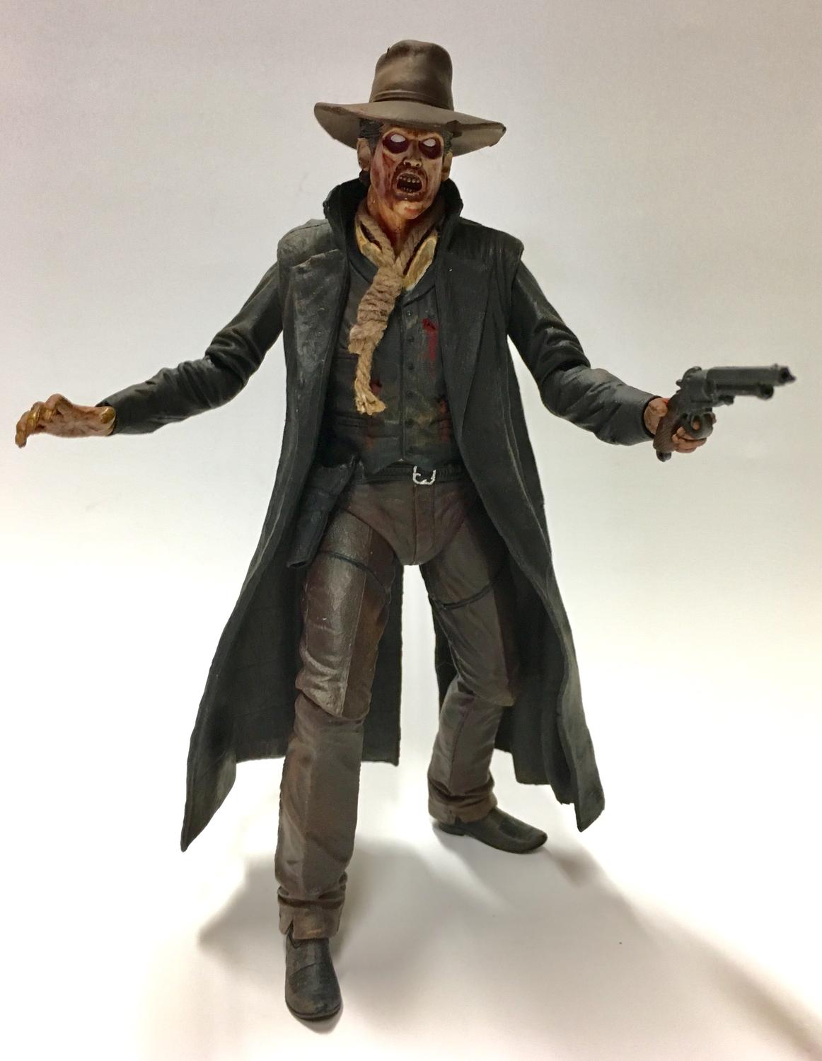 This demon charged undead cowboy wasn't a huge overhaul, more of a fun project. After listening to some classic Pantera "cowboys from hell" I threw this together. Pretty happy with the outcome. Body is a NECA Lobe Ranger. The arms were resculpted, losing the gloves and giving the arms a full sleeve look, bullet holes were added and body was weathered. The trench coat is from a NECA New Nightmare Freddie, repainted and weathered. The head, shotgun and hands are from a NECA Evil Dead Ash. The pistol is from a NECA Jonah Hex and the holster from the NECA Lone Ranger. The noose is from a Mezco Hellboy figure and the hat is from a DC Direct Saint of Killers.