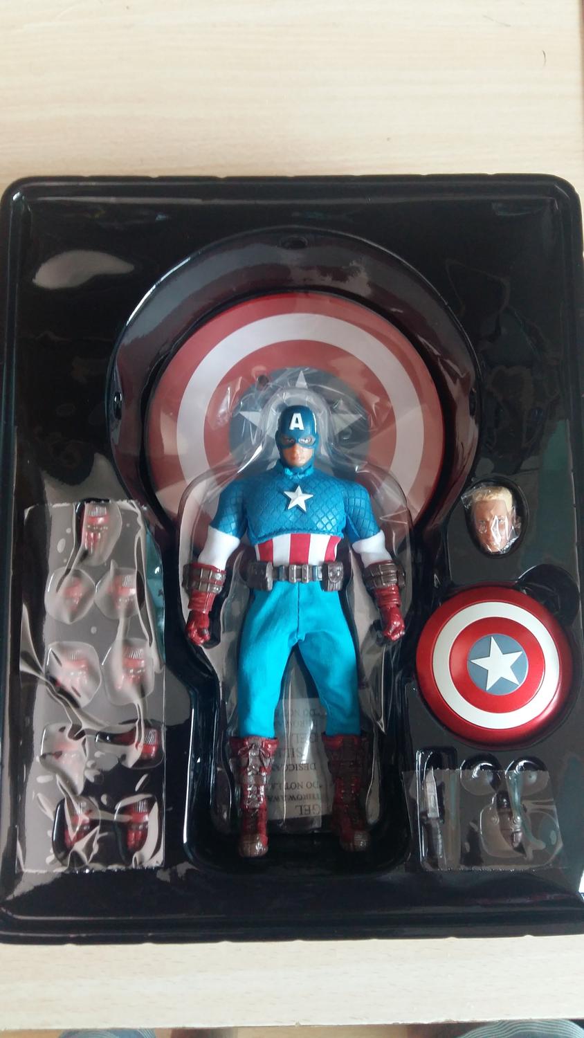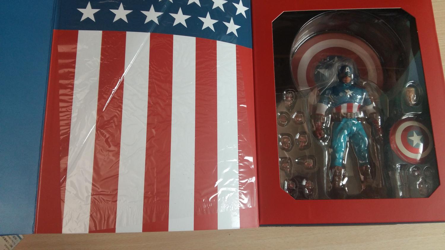 Here are some quick shots of the KO Mezco Cap. The box is not upside in the one picture, the promo shots were printed upside down on the sleeve. It’s not showing up well in the pictures, but the pants are a few shades lighter blue than the shirt. They feel like a lower quality cloth compared to the rest of the figure, which honestly feels as good as the legit Mezco BvS Batman, DKR Batman and Daredevil I have.