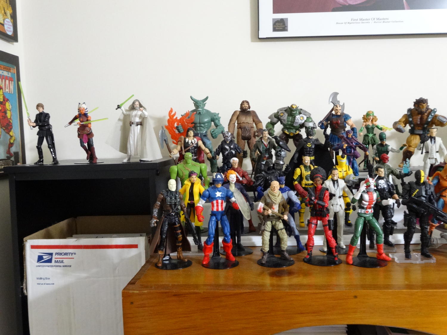 Here's a couple of pictures of the bookcase where I keep most of my MU figures. I usually take pictures in front of it because it has the best lighting. I have other figures scattered around (like my Marauders), but that area is a little...chaotic....I don't want to take any pictures there. It's near my art table and I have all my supplies and junk around there.