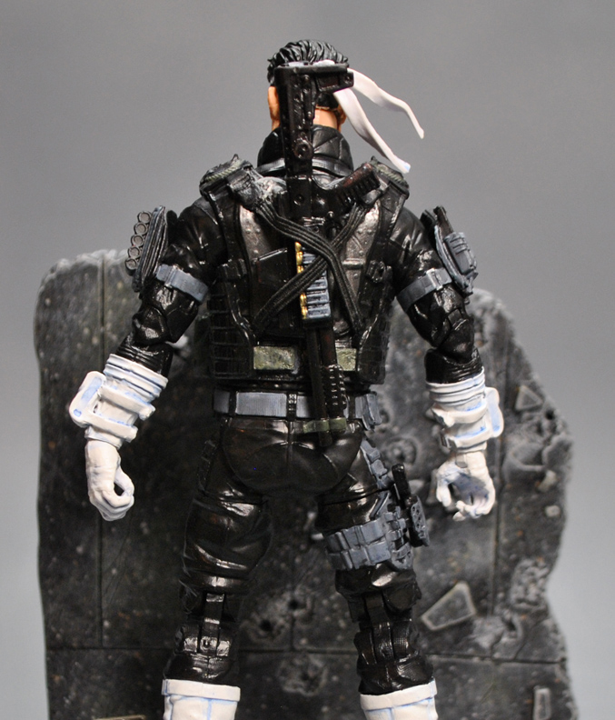 When evil needs to be punished you bring in the man named for the task, the Punisher himself armed to the teeth and armored for war! This week I bring you a special version of Frank ready to take on your Legends collection all by himself. The Punisher was created using the Civil War Crossbones body, Demo man arms, Walgreens Punisher head, and Captain America lower legs. Scarlet Spider pouches were added to bulk up the arms and he was repainted head to toe with subtle shading and weathering. Punisher's arsenal includes a 50 cal, M-16, pistol, rocket launcher, shotgun, and ammo bin. Elastic web gear was added so he could store all the weapons on his body in case he needed more firepower.