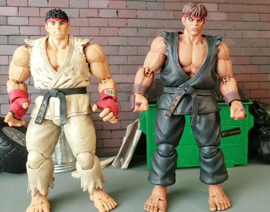 Both figs have unnaturally small heads relative to their bodies. The SF II Ryu is a bit taller, and actually the proportions on it look a bit better to me, though it may just be my SF II bias.