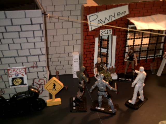 Ok, got alittle obsessed with the alley setup so little by little my MU city has started growing. I'm listing it as a WIP since I continue to add to it as room allows. So to the alley I've added a Pawn shop with working door, a zip line, and the newest addition is the old dilapated liquor store that is actually a Hydra safehouse. It has two stories, a breakaway boarded up window on the second floor, pull off boards over the doorway that can be used as weapons for figures, and the first floor boarded window lifts up to reveal a machine gun that I borrowed from the 25th Ann. Roadblock. I've also added a sewerlid that can be pulled up and used by the figures.
