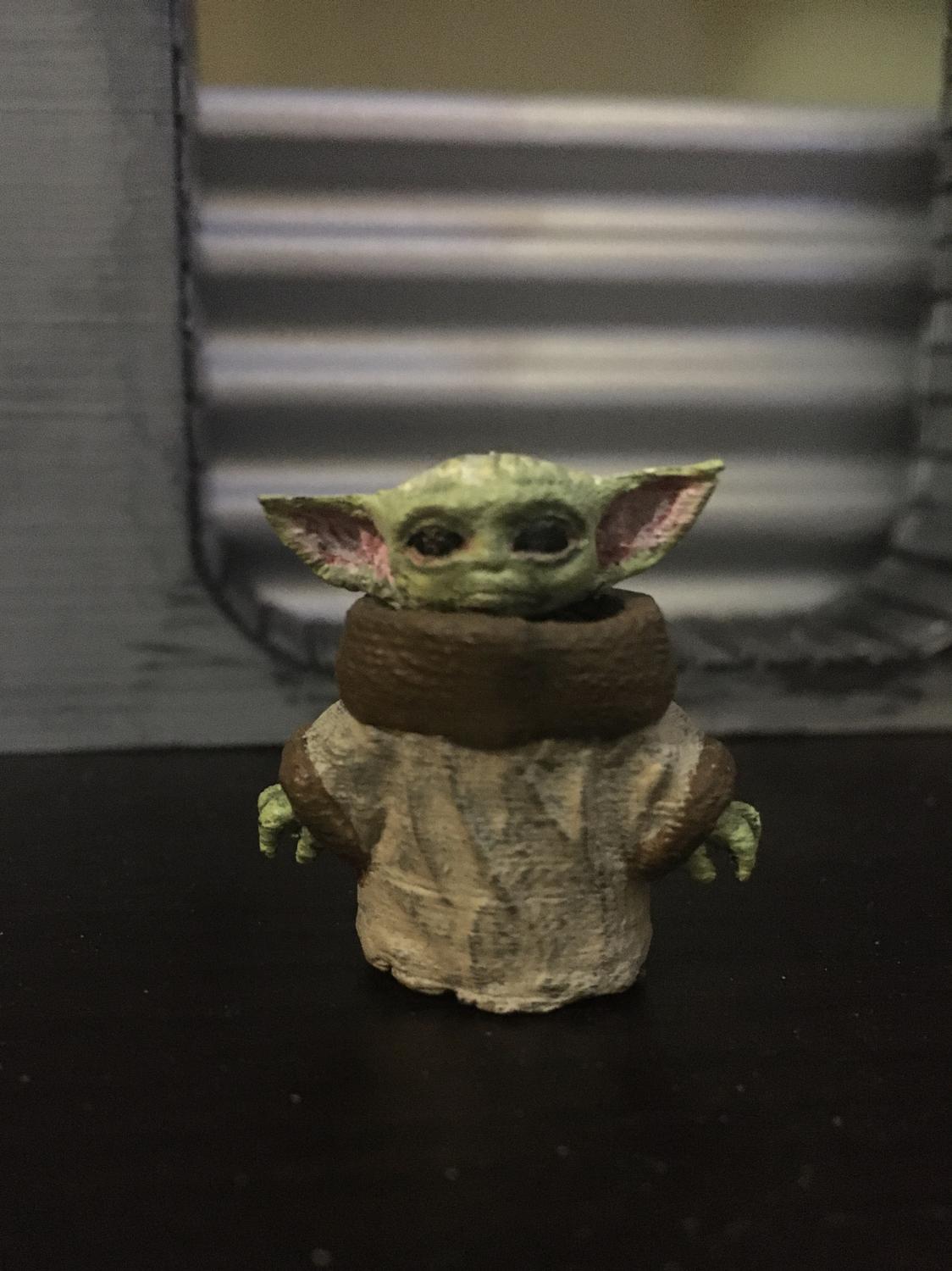 3d printed model of the child (baby yoda for now as we know it) scaled down, sanded and painted with custom clear stand