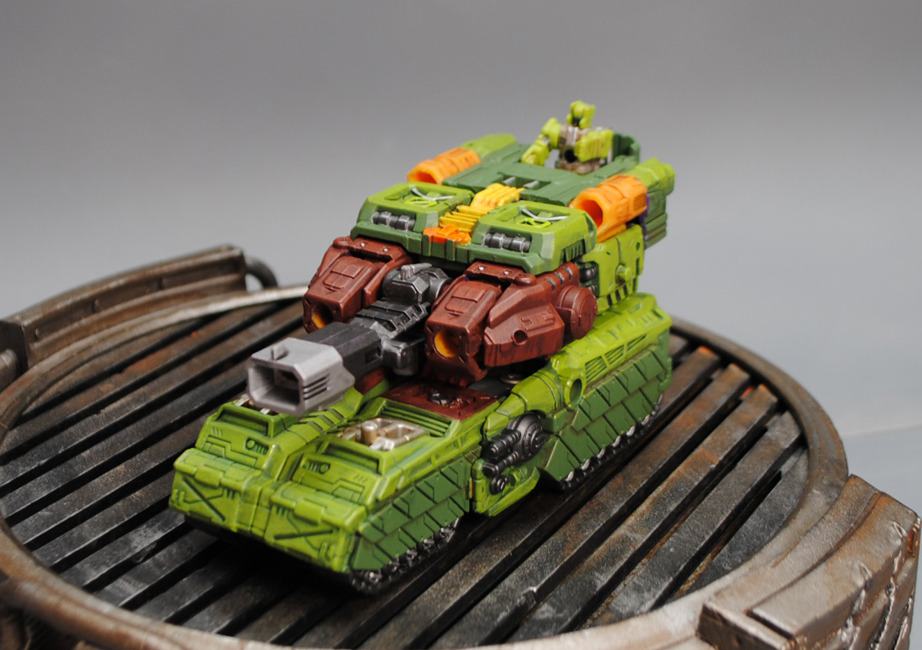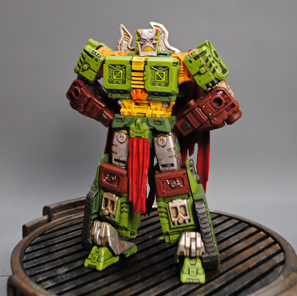 It's time for another custom, yes? This time I've gone and whipped up the Transformers most lethal adversary, Death's Head! He's been created in his green and yellow G1 look using an Impactor body, Titans Return Hardhead noggin and neck port, Marvel legends Brother Voodoo cape, part of black series Rey's tunic for his loincloth, and varius Transformer weapons/melee weapons. A lot of trimming/sanding had to be done so that nothing scraped during transformation and yes, the tank can wear the cape if you plug it into the wrist holes, hah! Death's Head was primered with Duplicolor Adhesion Promoter, painted with Testors Aztek Airbrush and Formula P3 paints, Testors Metalizer armor color lacquers, and sealed with Mr Hobby premium flat spray sealer. The Death's Head faceplate came from Shapeways via Fakebuster's shop named Ariel's Customs and has TONS of different character faceplates that fit on TR headmasters.