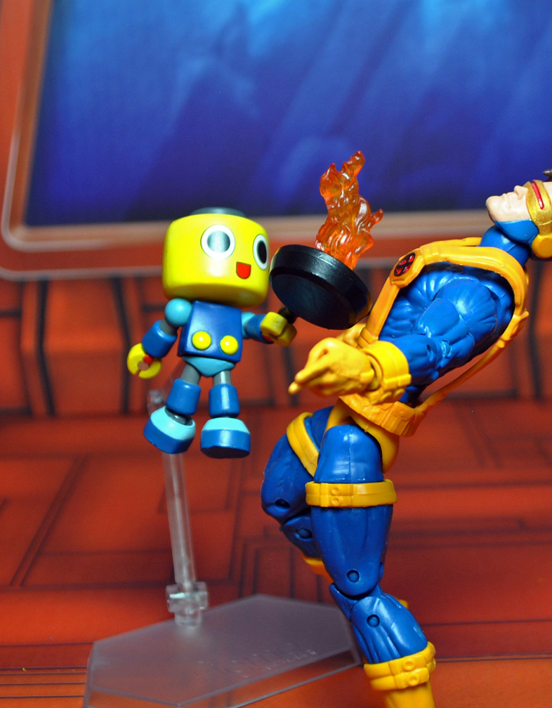 Look like you're going to be crouching a lot to attack because you're up against Marvel vs Capcom's SERVBOT! Otherwise known as 'Kobun' this diminutive little fellow is one of megaman Legends Tron Bonne's servants that whip up tasty meals and clean house. Here I've taken the one that came with the Capcom PvC Tron statue and replaced some of his leg/ankle joints, added magnetic accessories, and even scratch built his helicopter-head attachment! Servbot's knife, spatula, and pan all attach to his hands and you can plug him into a flight stand for his copter-drop attack. Check out his flaming frying pan curry attack! He's even to scale with your Marvel Legends standing only 2" tall.