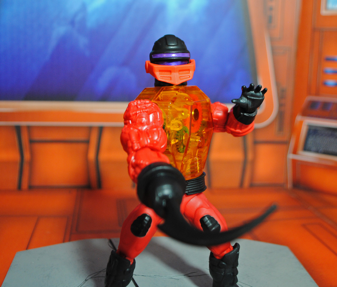 Here's a Masters of the Universe Roboto Clone, Robotor! Is he friend or foe, how was he created, what does he want? That story is up to you! Here I took a spare Roboto Torso and matched it up with the Masters of the WWE Kane body after removing the black paint from the legs. Tamiya clear orange was used to tint the clear body and he was detailed up with reverse-roboto colors. Since Kayne didn't come with an axe attachment a new one was fashioned from a TMNT multi armed robot foot solider and a ML Machine mas belt used as well.