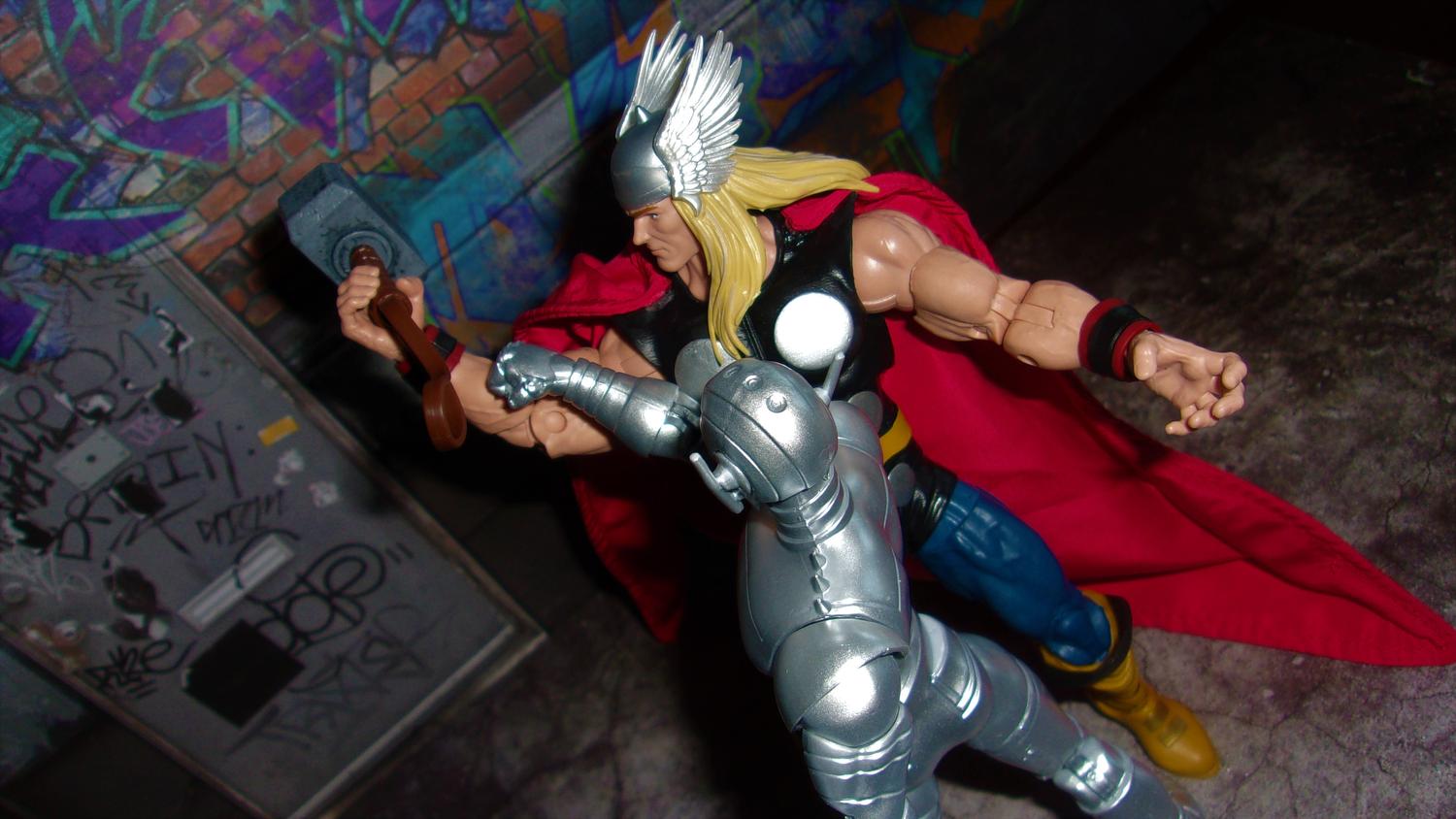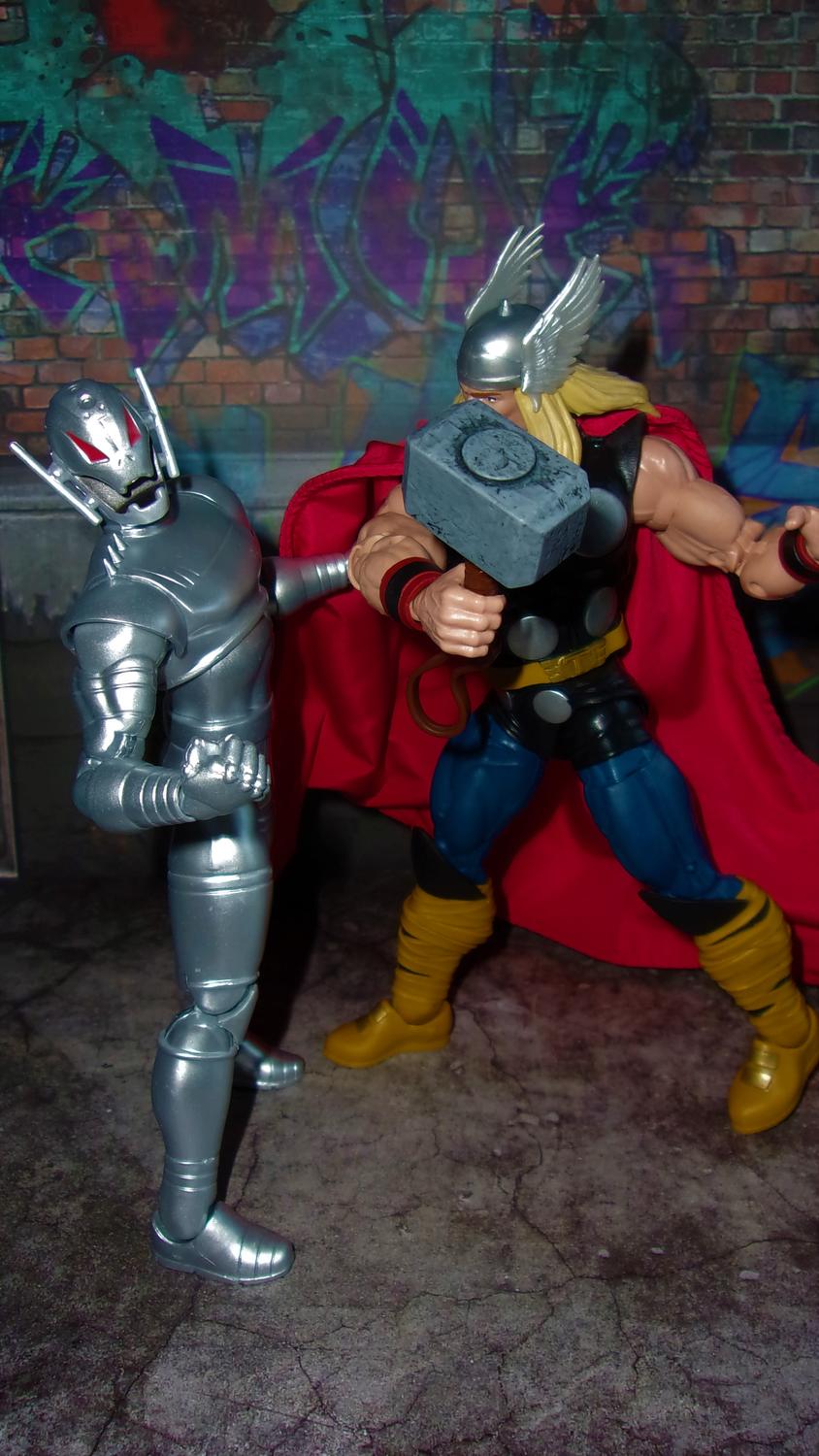Let's put this "Ultron looks like a kid next to Thor" debate to an end, shall we. Ultron comes up to Thor's eye/forehead level, so I fail to see where he looks like a "kid" next to Thor. And he is a robot, his design is sleek, yet elegant with a gleam in his eye! Pics don't lie, Ultron looks perfect next to Thor!