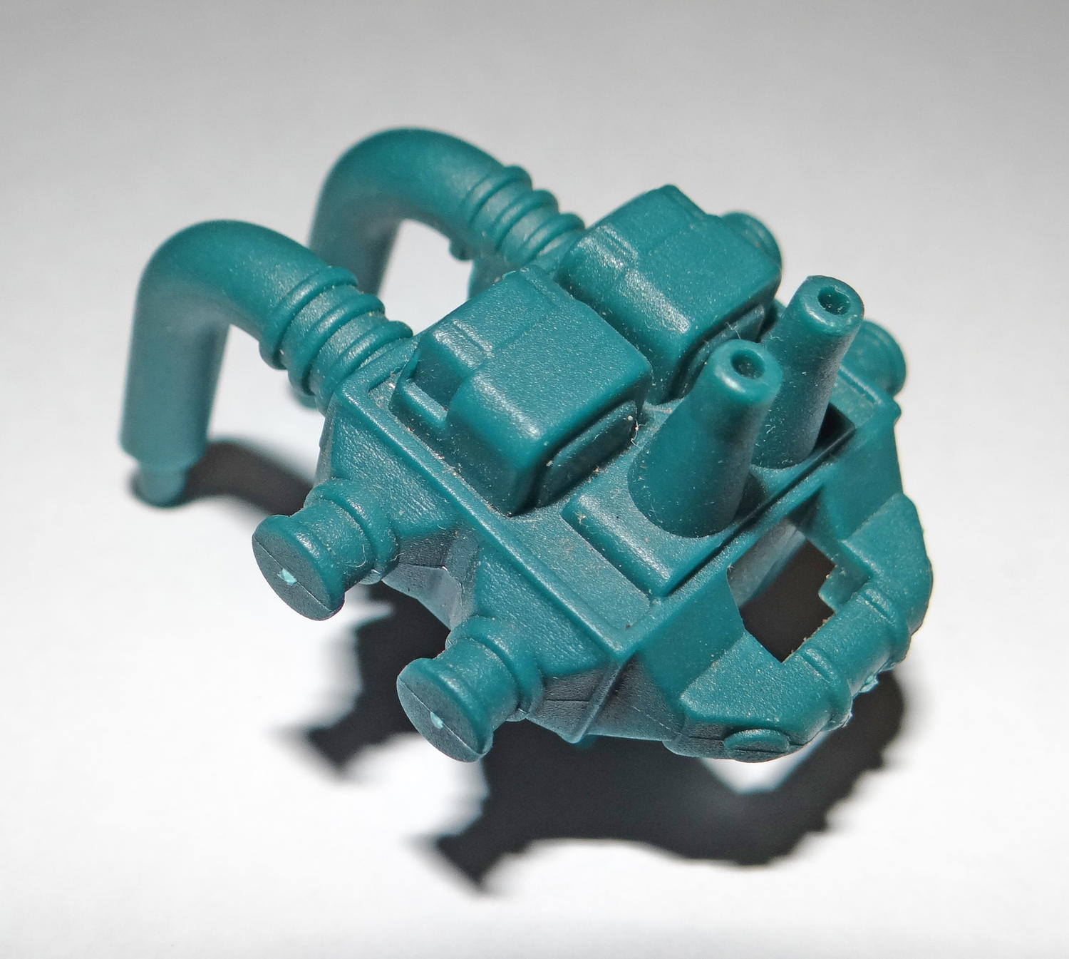 • Small (Approx. 1-1/2") teal colored clip on engine or backpack accessory. Looks like it clips around some sort of rounded piece. Maybe the top tubes attach somewhere?