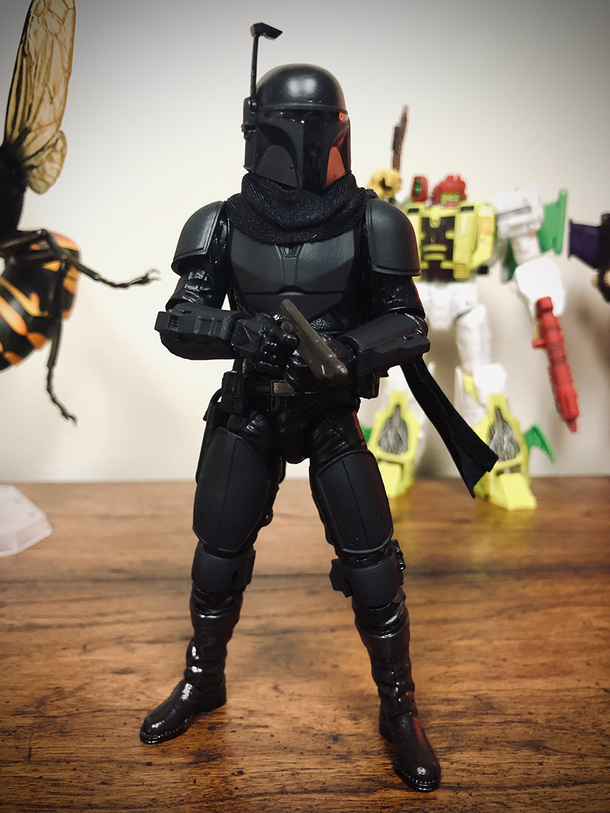 Black Death Watch Mando: Wanted to try a new technique here. I try to do with every project. The entire figure was broken down then sprayed with VHT Satin Black Auto Upholstery Dye. Then used gloss, matte, and satin topcoats to break up all the black. Then made a quick scarf. Sorry for the crappy pic. The only one of this project I snapped.