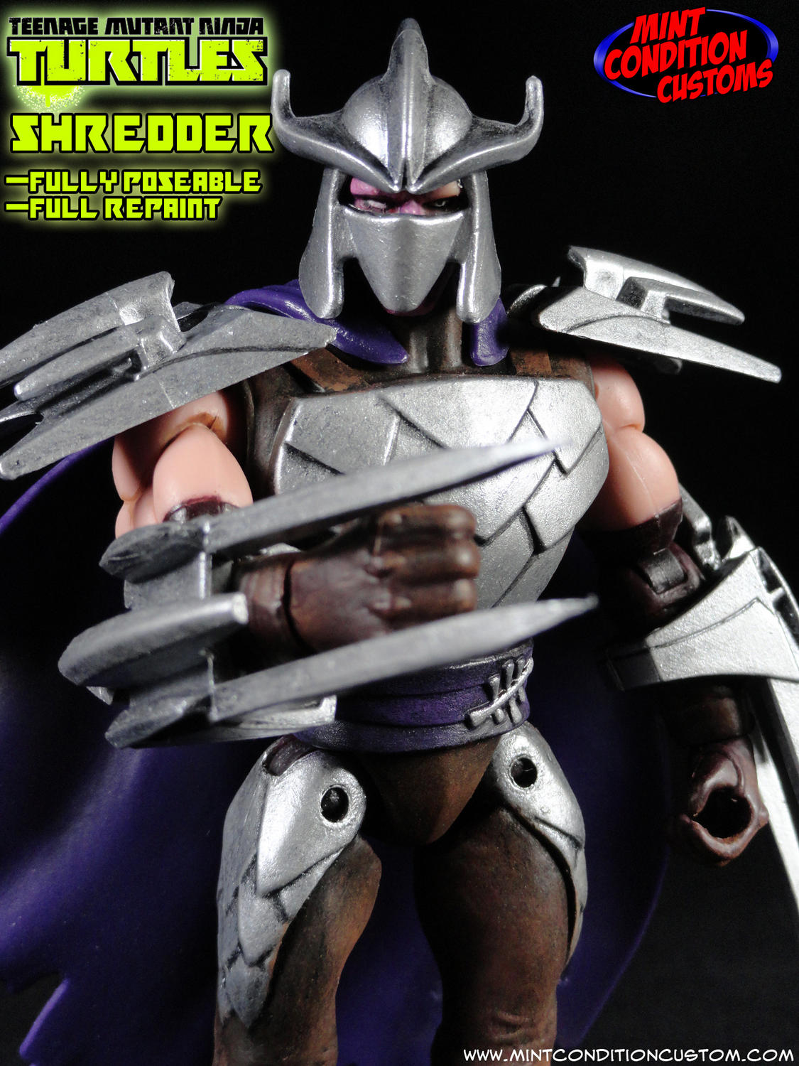 The current figures based on the Nickelodeon TMNT series are pretty fun, though every character except the four turtles is extremely lacking in articulation. So here I present a fully poseable Shredder figure! I had to use parts from the original Shredder Playmates released, and the new Shredder figure with the removable helmet. One had poseable arms, the other had poseable legs, but even the one with poseable legs was far from perfect (or even functional). I was expecting this to be an incredibly easy custom to make, but it turned out to be one of the most frustrating things I’ve worked on in quite some time. I had to crack open torsos, do some serious dremeling, and I’m still having flashbacks about prying off the arm and leg armor and keeping it intact. But in the end, I think it was worth it. I shaved down the arm blades to make them appear sharper, and gave the entire figure a full repaint, including the head underneath the helmet. I also repainted his katana and shuriken. After getting everything assembled and finished, he actually ended up being a little taller than before, which puts him at a better scale with the TMNT figures! And now the Shredder is now ready to dine on TURTLE SOUP!