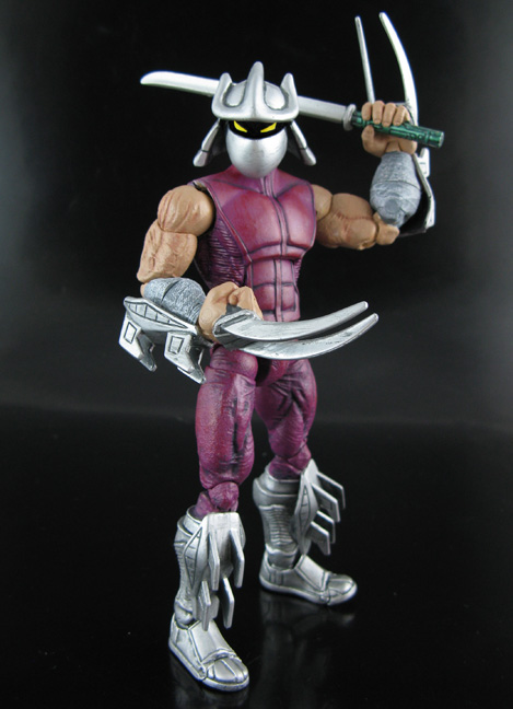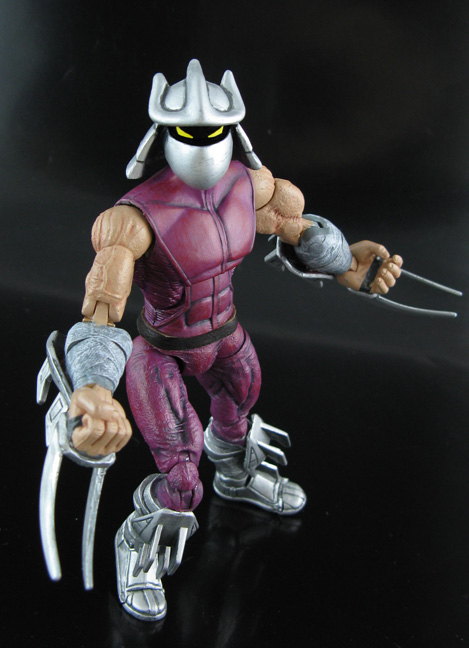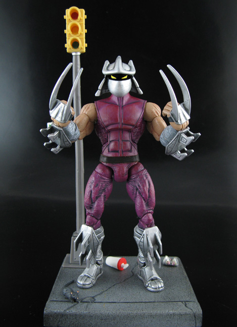 The Teenage Mutant Ninja Turtle's deadliest foe is here, the Shredder! Ol Shredhead was created from the upper half of an XMC Magneto, lower body/upper arms of Sentry, Ripclaw forearms/lower legs, Sigma 6 Storm Shadow armor spikes, and a custom modded head from an old Shredder figure. He features a real leather belt and double ball jointed neck along with a matching base that has a street light and garbage laying around. Tamiya spray lacquer Leaf Silver was used and it's my favorite silver paint to date. Works on everything but soft rubber capes.