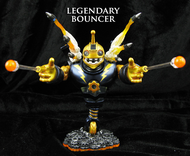 Legendary Bouncer is my first Skylanders Giants custom mod! His wheel doesn't leave a lot to balance so I left him on the base, a small sacrifice. But where he doesn't have legs he makes up in firepower! Bouncer has twp bounce-shot finger attachments and full arm articulation. His head is ball jointed and now his mouth as well as his eyes/chest glow with the LightCore feature! Still need to take out some baddies? Bouncer's shoulder pads flip up and you can attach missiles to them now for added destruction. Probably my favorite Giant so far, Bouncer is one robot you don't want to mess with!
