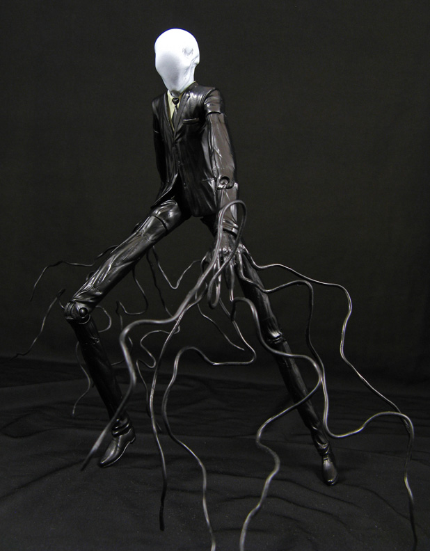 Lurking in the woods, in a deserted old factory, or right behind you at this very instant is the unknown entity called the Slender Man! He's a creepy urban legends/internet meme that inspires terror and was pretty cool to make. This custom Slender Man action figure follows the same recipe as my original using a Dr Who Silence figure with limb extensions, sculpted over face and bendy tendrils. The tendrils for this custom Slender Man figure were made using plasti-dip over wires and inserted into the fingers. A combination of spray-on Plasti-dip and regular dip-in was used to seal the wires and get them uniform. Watch out, the Slenderman comes...