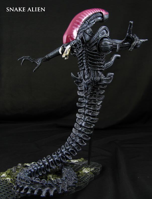 What should have been a Predator's vacation getaway to torment some humans at New Shanghai on Vega 4 has turned into a nightmare hunt! The Super Nintendo Alien vs Predator game featured some pretty strange plot but introduced us to some cool looking Alien concepts. Here is my take on the Snake Alien boss from that game created using a NECA Xenomorph Warrior upper body fused to a McFarlane Queen Alien tail section. Aves Studio Apoxie Sculpt was used to add extra sculpt and I gave this custom Snake Alien figure and a pair of fangs added paying homage to the Kenner Snake Alien design. Keep an eye out as I plan to make the Bat Alien and Green/Blue armored Predators that were the main characters in the game!