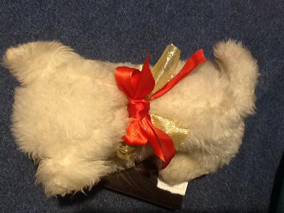 Hello, I writing to hopefully find out more about my grandmothers white cat plush. Sadly she has seen better days, as only recently her original bow was cut off by one of my cousins. So I had to make a quick replacement. Her original bow is the lighter red with a gold border. Sadly not clearly shown in the picture. I believe her eyes are glass and are light blue. And she has plastic wisckers.