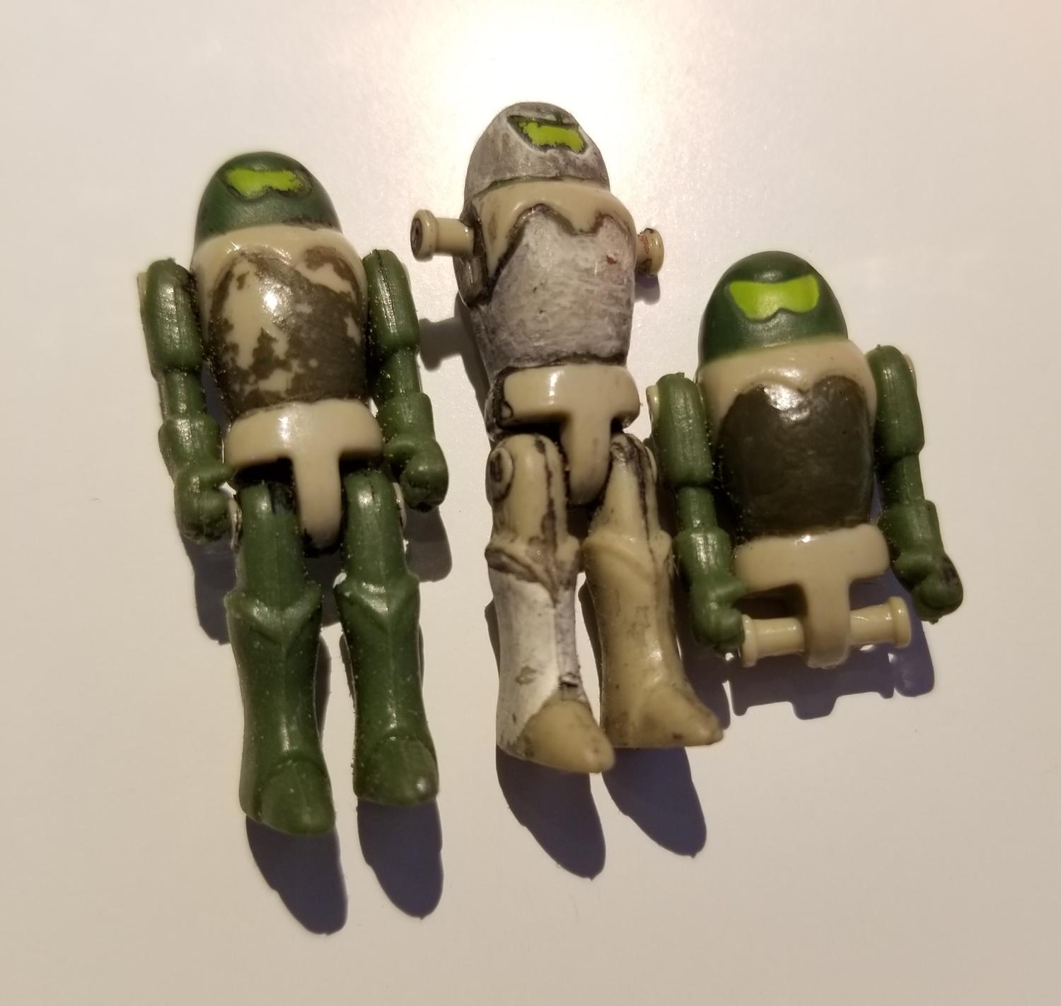 First, these little guys are from something so familiar, but I can't remember it. Someone else asked about the same lil dudes before, but now I can't find that post lol. Any ideas? This next one is SO familiar to me but I cannot remember the line name. They had these great larger ships that had cool gimmicks: And these are just fun cheap lil robots and army men I bought at a Sam's Club or something in the very early 90s/late 80s. Fun stuff! Thanks all! Beau |