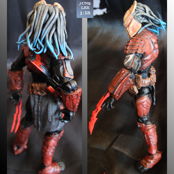 2- Mcfarlane Scar predator AVP diorama (1:18 Scale) 3- Resin cast arm gauntlets, greaves, belt, shoulder armor and head from the scar. a. The shoulder armor is a flex cast resin. 4- Dreads are sculpted from flexible compound ratio 60/40 of ProCreate 5- Chest armor, boots and clan detail armor is sculpted using AVES and "Green Stuff" 6- Everything painted. the sculpting was based on some armor aps from the GI Joe Viper. The paint scheme was inspired by the red Mandalorian in the EE exclusive pack Dred Priest. Last edited by JuneLee; 12-04-2014 at 10:46 AM.. Reason: added scale in title |