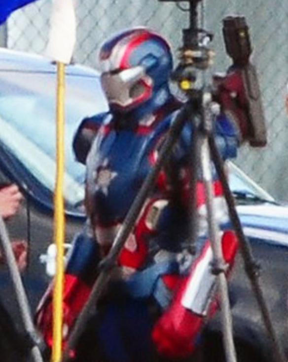 "Photographers caught the first look at one of the new villains in the movie, the Iron Patriot, who is sporting armor that could give Stark a run for his money. First introduced in the comic "Dark Avengers #1," the Iron Patriot might have a suit of high-tech armor with a Captain America paint job, but the man inside is not a hero. That's actor James Badge Dale ("The Departed," TV's "24") as Eric Savin, one of the villains of "Iron Man 3." In the comics, Savin is a soldier who is gravely injured in a land mine explosion and reanimated as a cyborg called Coldblood-7. It looks like the movie merges his character from the books with the Iron Patriot armor (which was worn by Spider-Man's nemesis Norman Osborn, aka the Green Goblin)."
