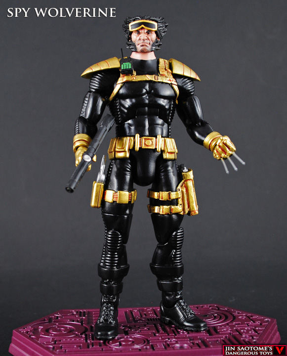 It's time for more Marvel Legends and here you get Wolverine in his spy gear! A homage to the toybiz vintage figure, I created Spy Wolvie using a DCU Year One Batman body, cast House of M Wolverine head, current Wolvie hands, and alt head/pads from an original ML wolverine. He has a magnetic removable radio that attaches to his right shoulder. Web gear was added and he was given the sleek black and gold uniform you remember. Removable goggle were made and a halo backpack completed his look.