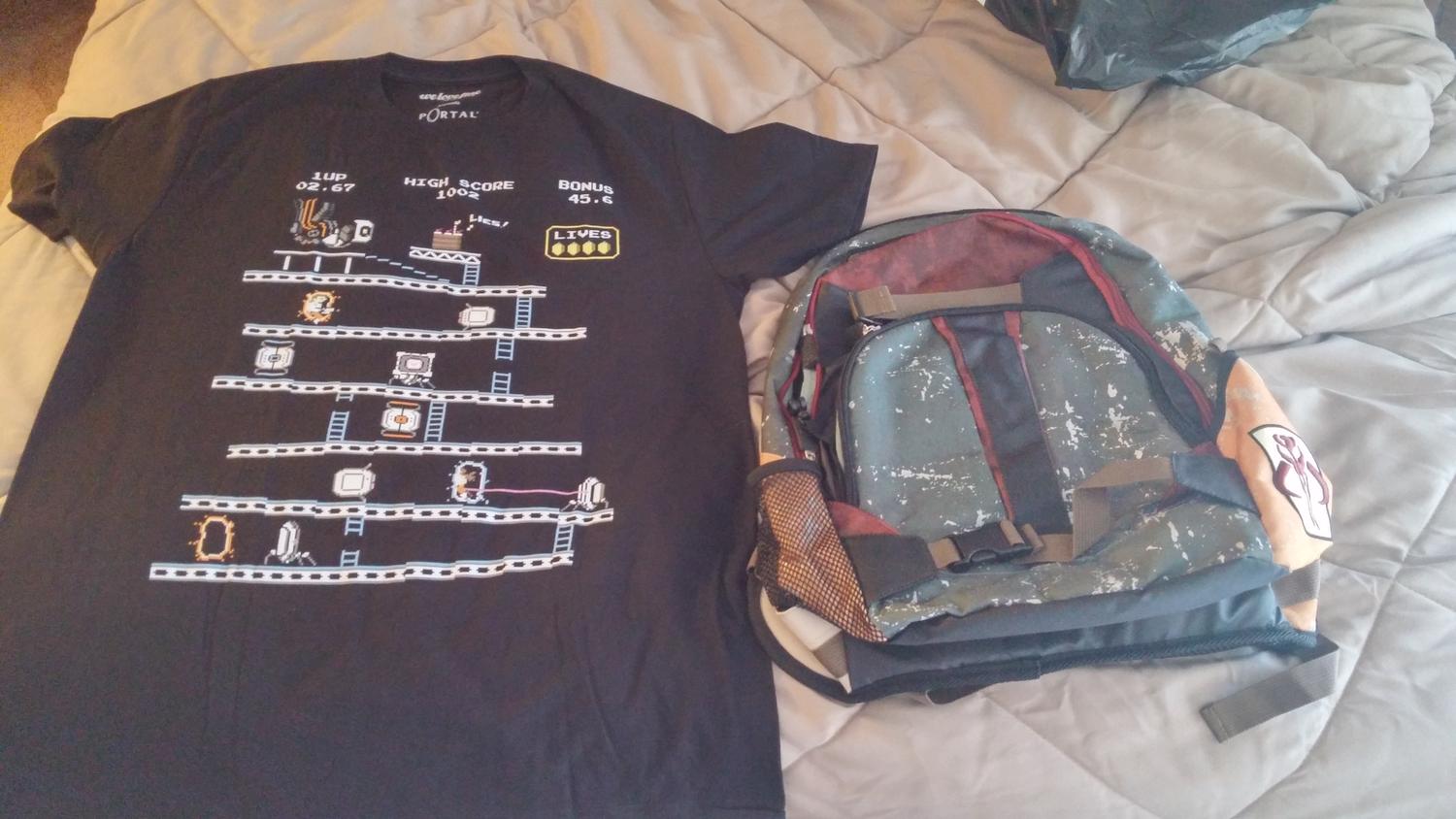 go my hot topic order in today! a portal/donkey kong mashup shirt and a boba fett backpack!!