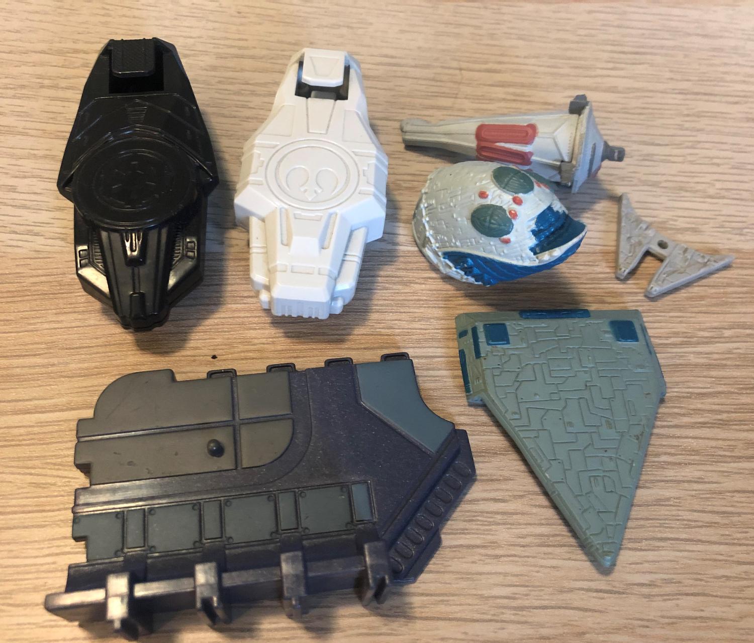 The front piece of the Millennium Falcon on the far right seems to have came from the line called "Tombola" which made small Star Wars figures and ship models that came with chocolate eggs, similar to Kinder Surprise.