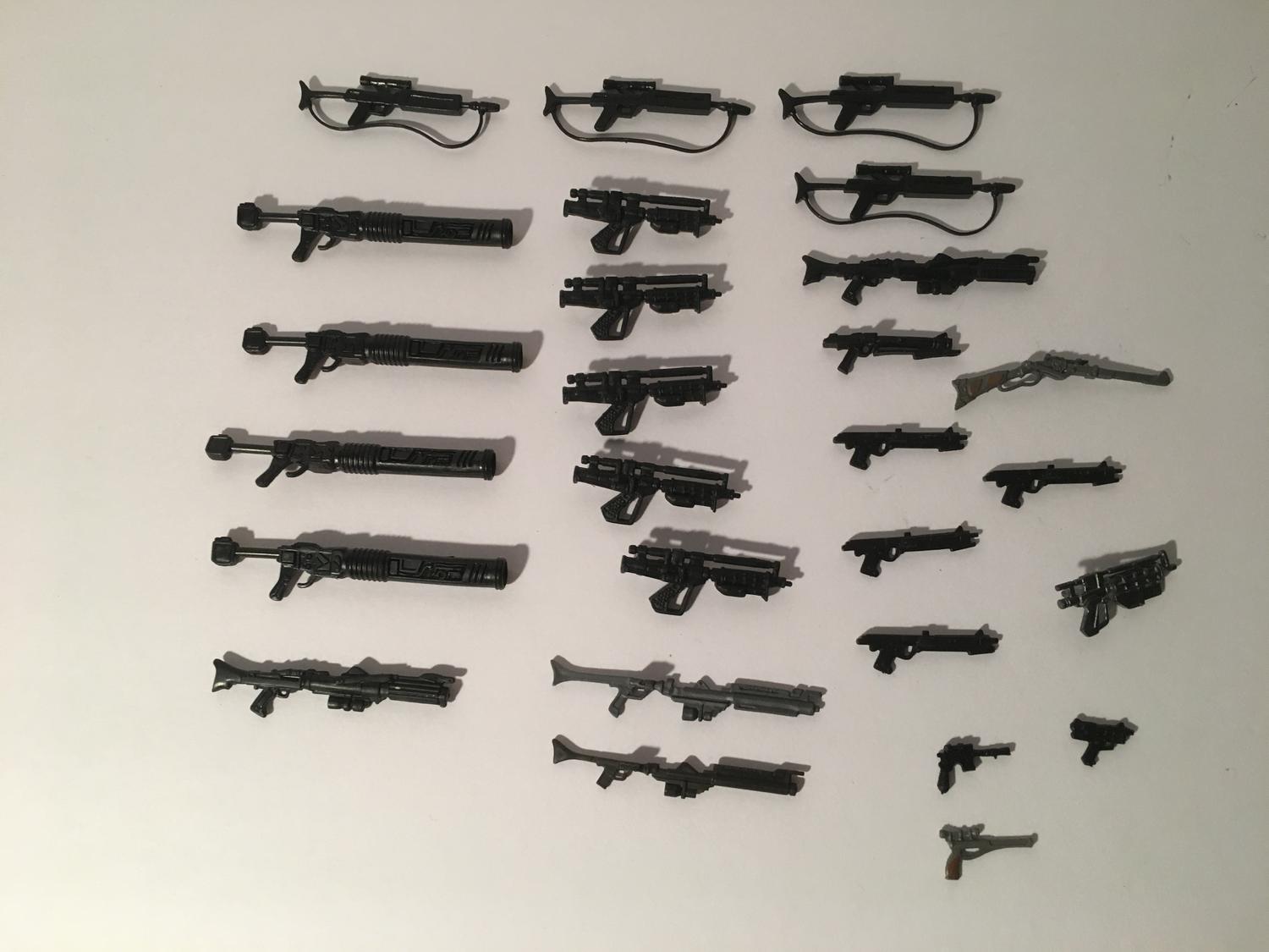 Just looking for confirmation I'm pretty sure these are all blasters for the Hasbro figures if I'm right or wrong please lmk. The missiles also came with this same lot so I'm assuming they're Hasbro Star Wars as well? If anyone knows what the missiles go to that would be of great help. Thanks!