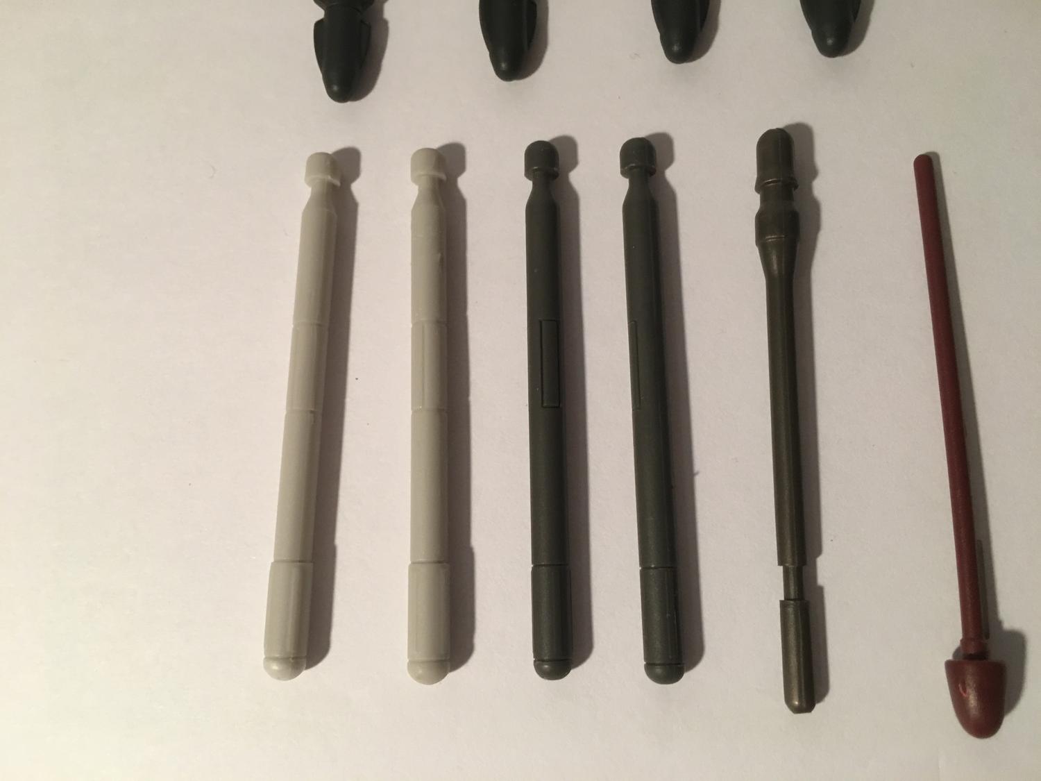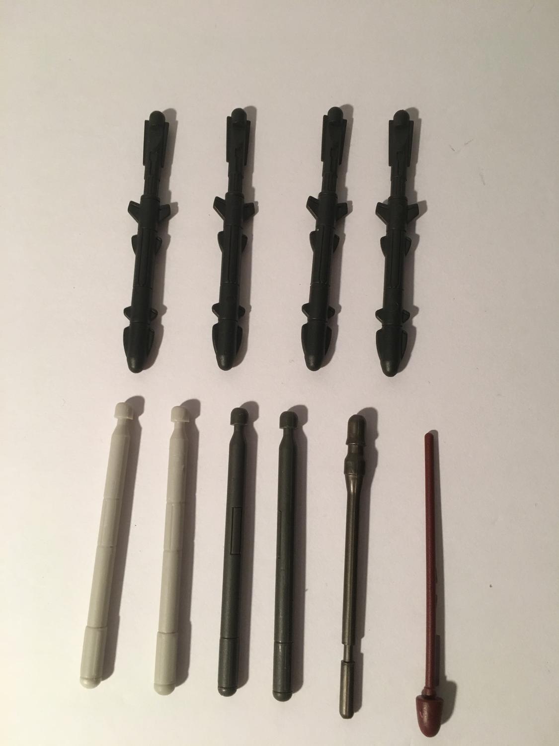 the off white bottom left missiles are from the REPUBLIC GUNSHIP ("Crumb Bomber") rotating launchers...I think. The rest are likely star wars, too. |
