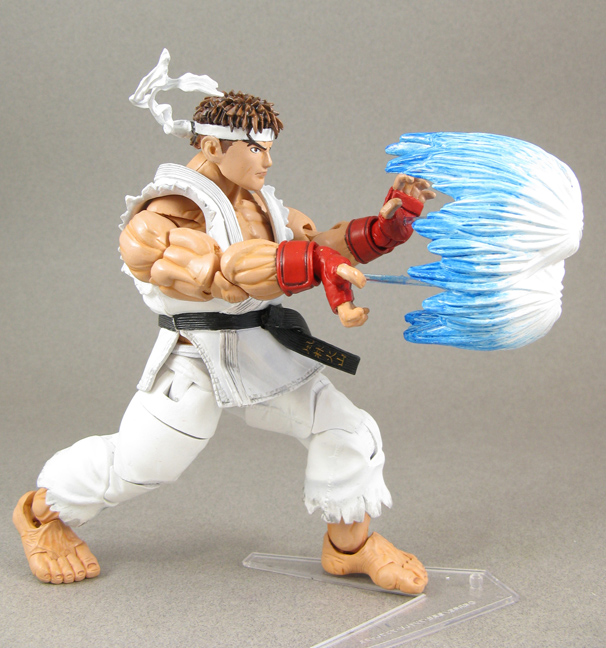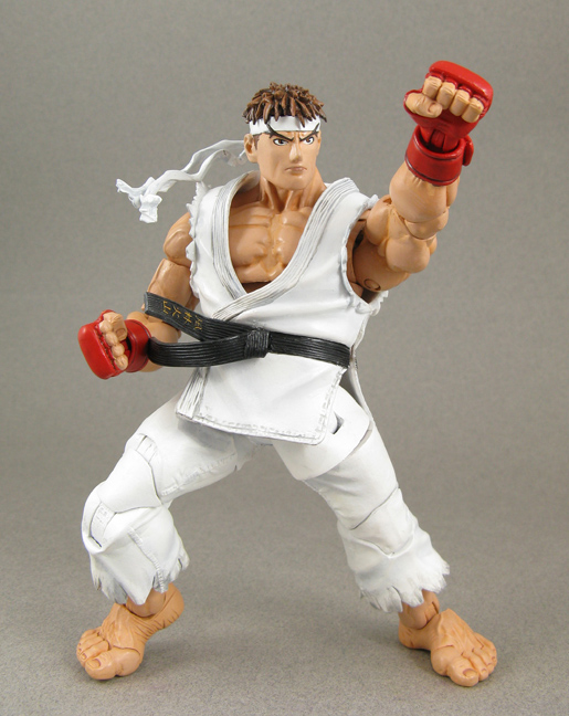 The NECA Street Fighter 4 Ryu was styled to look like the game but unfortunately that look isn't for everyone. I wanted a younger Ryu styled after his SF Alpha/Marvel vs Capcom 2 design. To create this custom Ryu I used a pvc minibust Ryu head and modded it to fit on the SF4 body. The gi was modded so it could be removed, pant ties added, and the bandana/gi belt were ball jointed to help showing motion in action poses. His Fireball was created from an old Iron Man base and pegs into the hands. All the joint holes were filled and resculpted and Ryu's update was done!