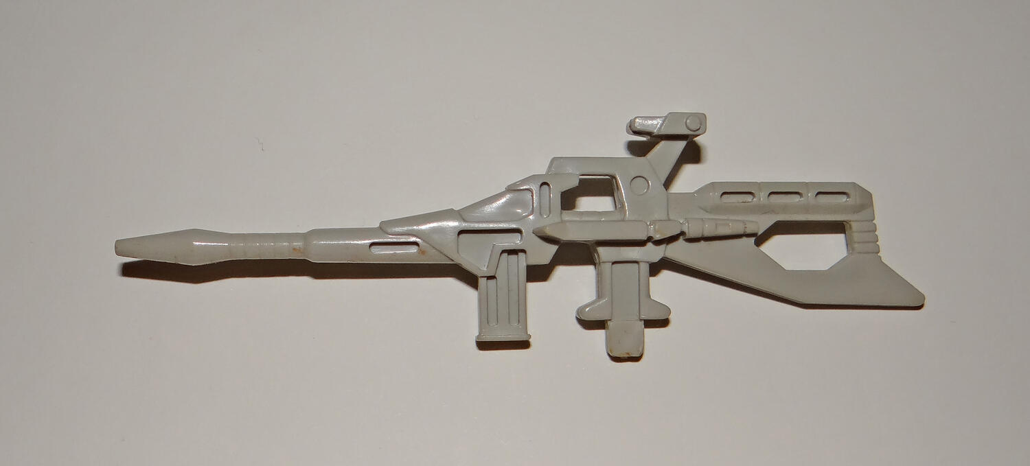 1. 4.5" long gray plastic rifle. Looks and feels like Transformers but I couldn't find it on the transformerland site. Has a flat handle, not rounded like a typical G1 Transformers weapon.