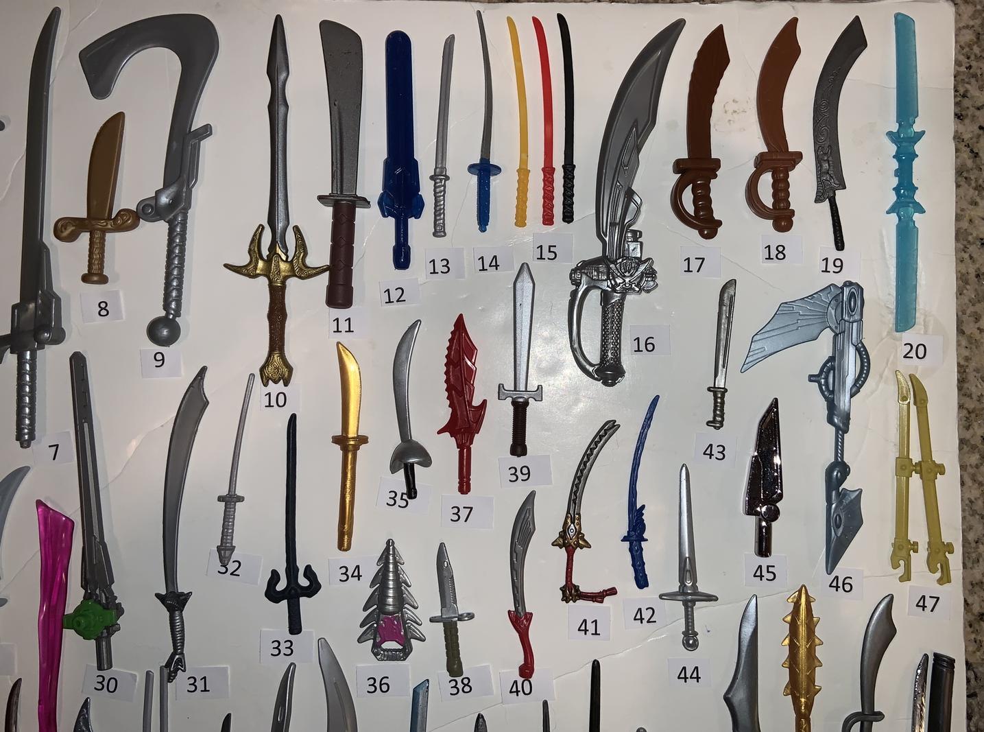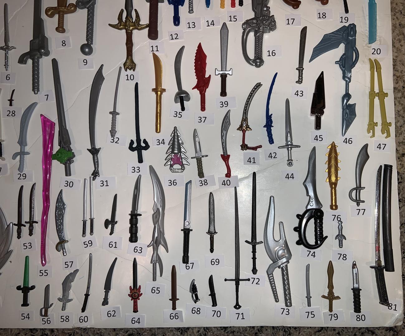 The following have been identified: 3. Playmobil 10. Marvel Legends MCU Heimdall's sword 16. Power Rangers Super Megaforce 17. Jake Neverland Pirates 18. Jake Neverland Pirates 19. Batman Beyond Future Knight 20. McDonalds Transformers Sideswipe 21. Lego 23. MEGA Bloks Pirates of the Caribbean 27. TMNT Multi Arm Shredder 30. Transformers Platimun Edition Springer 36. Power Rangers Dino Charge 44. Imaginext "The Legend of King Arthur" sword 46. Batman Beyond 1999 Batman Future Knight Batman 53. Chap Mei Pirate Expeditions swords 55. 2003 Master Gundam 56. GI Joe Ninja Battles 2005 58. Lego Trolls 59. Marvel Universe (or X-Men Origins: Wolverine) Deadpool swords 62. Lego 65. Power Rangers Jungle Fury Shark 67. Sigma Six Snake Eyes 70. Playmobil 71. LOTR ROTK Aragorn Pelennor Fields 72. LOTR Armies of Middle Earth Mouth of Sauron 79. Imaginext Prince Roderick sword 81. Hot Toys Snake Eyes Last edited by MGB; 05-24-2021 at 11:39 AM.. Reason: Updates |