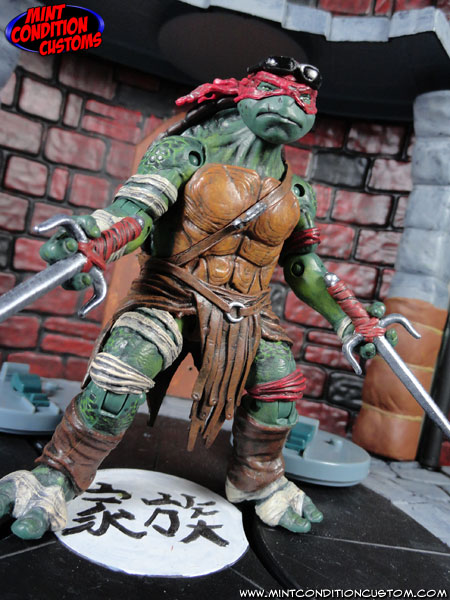 The official Playmates figures for the new Teenage Mutant Ninja Turtles movie leave a lot to be desired, so I decided to fix them in order to make them completely movie accurate. I studied several images and trailer stills in order to get down every detail. Each figure has been fully repainted from head to toe, with spots on their skin, Japanese Kanji on their bandanas and shells, and realistic shading, highlights, and weathering. For Leonardo I used the head from the Combat Warrior figure (the deluxe sized figures), because it’s actually smaller than the basic figure’s head (which is too big), and it sits better on the figure, and added the NYC button on his weapon strap. For Michelangelo, I added the shades around his necklace, and the tattoo on his left arm. On Raphael I added the scar over his lip, the tattoo on his right bicep, and some shades that fit on his forehead. For Donatello, I also used the head from the Combat Warrior figure, because the sculpt was much more detailed, and looked better. I made his glasses out of craft wire, with sewing thread for the tape and painted them to look like tortoiseshell frames. I also used sewing thread for the electrical wiring to connect pieces of his equipment. Of course I also went through and gave all their weapons realistic repaints as well, adding real chain to Mikey’s. And now that the Ninja Turtles actually look like they do from the movie, they’re ready to take down Shredder and the entire Foot Clan. COWABUNGA!
