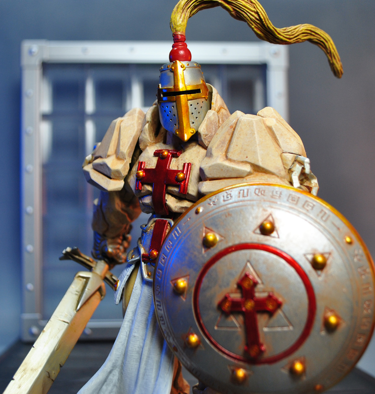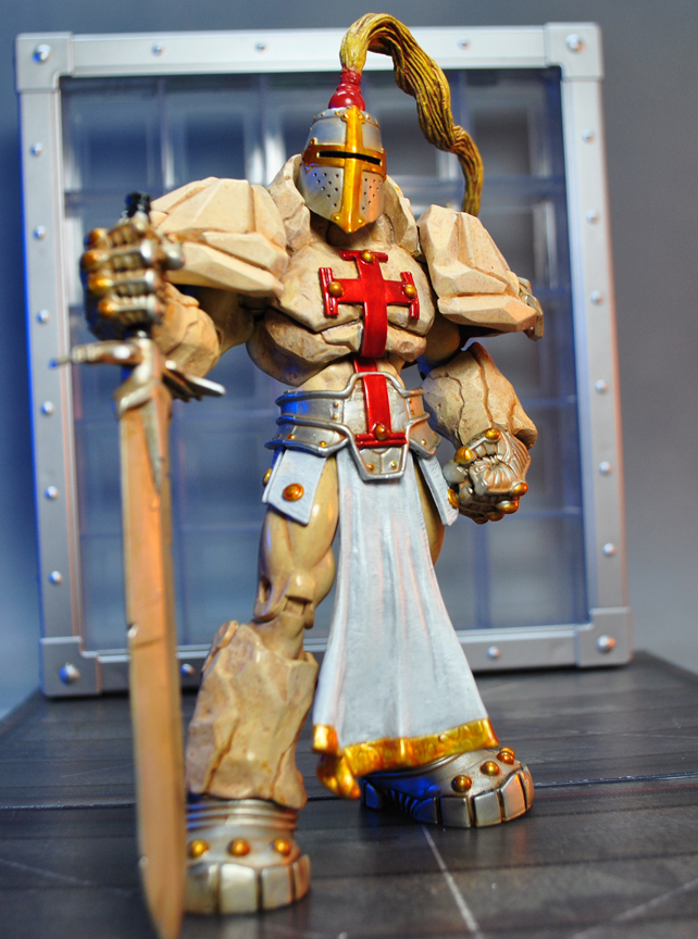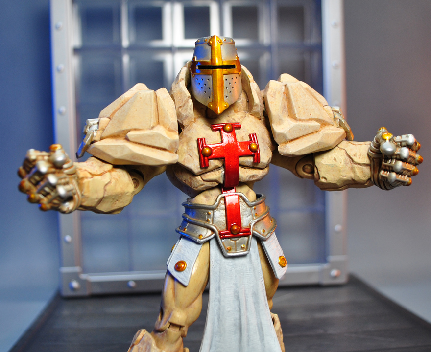 Here's another original custom creation for your Masters of the Universe Classics collection, Tem-Plarr! Modeled after the Templar Knights of lore this stony stoic statue was created from a Callix body, Mythic Legions knight head, Omega Red ponytail Iron Monger BAF fists and feet, Ceratus waist armor, Dr Strange cape section, Lightseekers shoulderpads, and sculpted detail using Aves Apoxie Clay. His broadsword was made using a ML Ares sword with a new hilt and a Digimon shield was modified into a Templar version that plugs on to his left forearm. Tem-Plarr was given realistic stone effects and weathered metallic detaling on his armor using Testors Metallic Lacquer. |