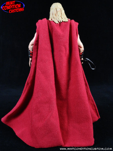 The Marvel Select Thor Dark World figure is cool, but I wanted to give him a better looking cloth poseable cape. I made my own pattern for it, carefully measured of course, and cut it out in this really great red material that wasn't too heavy and looked nice for the scale. I used some hemming tape to wrap some bendy armature wire down each side of the cape so it could be poseable. To attach it, I cut off the cape clasps from the Thor figure, and dremelled a hole in each side. The cape was then threaded through, including the wire. I then hot glued it down to the shoulder pads, and carefully reattached the cape clasps. A little paint later to touch everything up, and now Thor is ready to fight with a much more regal looking poseable cape!