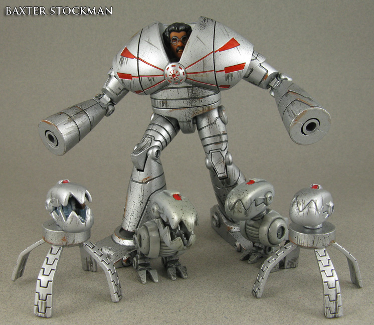 The Baxter Stockman figure in the new 2013 TMNT line was cast in a dark brown-metal color and needed a paint job. I also added ball joints to the ankles where they normally snapped on without motion. In the show his hands also pop off and sprout mouser heads, running around and attacking the Turtles. Here I opened up his arms and modded the hands to be removable too. The fingers were made of a waxy plastic and needed to be undercoated with Kleanstrip Bulldog Adhesive Promoter spray before the silver could be added. I gave Baxter Stockman's armor a bright silver finish, metallic red detail, and some sewer-battle-weathering. Then I tossed in a few mousers for him to control as well. Baxter Stockman is ready to take on the green brothers once again!