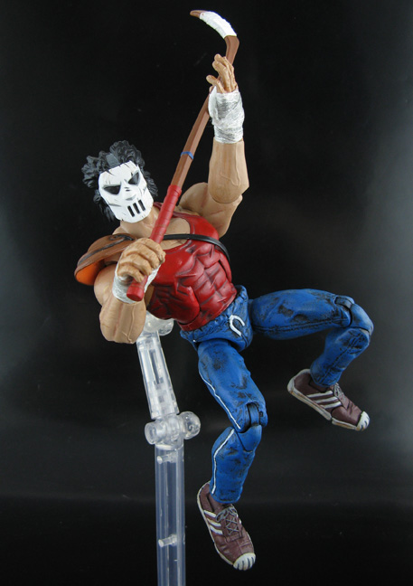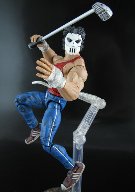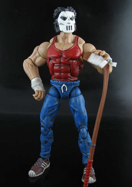 GOONGALA GOONGALA! When you hear the battle cry of Casey Jones you know some poor criminal is getting their rear ended handed to them! This masked vigilante was made an original Casey Jones head, Guile upper body, a wrestling figure's hands, and a CBH Savage Dragon lower body. The bat (real wood!) and golf club are hand made, the hockey stick coming from some other figure. The shoulder pad armor is removable and was also modded from the original figure for that extra bit of nostalgia.