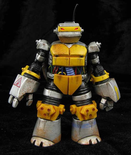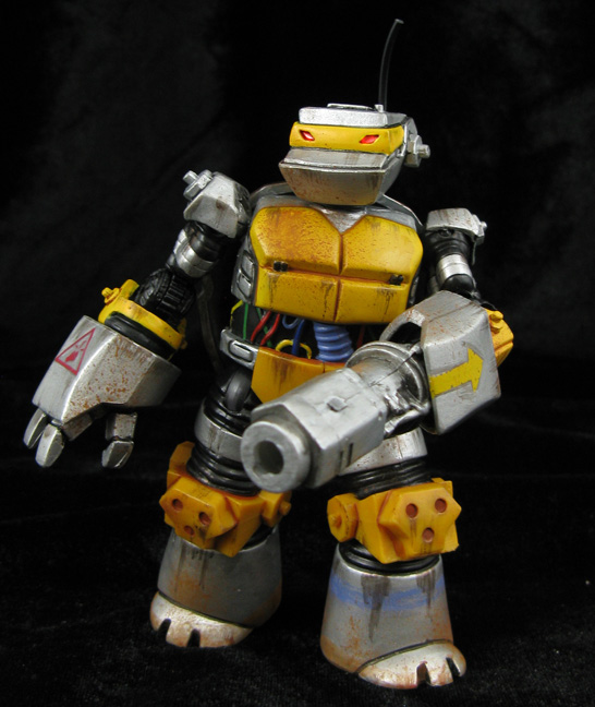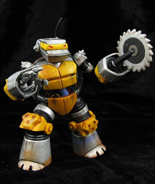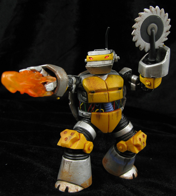 Teenage Mutant Ninja Turtles Metalhead is one awesome figure, only problem is he lacks a bit in arm articulation. I fixed this by using the upper arms of an 3 3/4" Titanium Man and the knees of a Halo Master Chief. The plug fit right in and I glued Metalhead's forearms on, also hollowing out his shoulders to make shoulderpads. Metalhead was then given magnetic attachments like his buzzsaw and blaster. A flame unit can be attached to his right hand and he now has full articulation like his Turtle creators. Metalhead was then painted to match the concept art shown at Toy Fair and given a sewer-weathered look along with some added detail tweaks. Now he was ready to sock it to the Foot Clan!